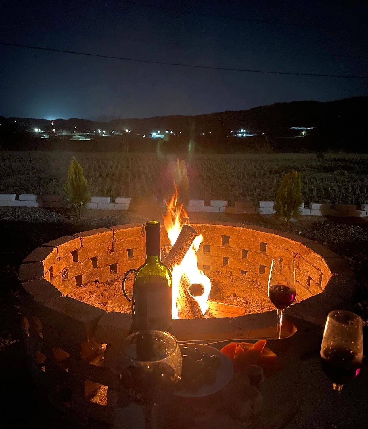 O선배가 준비한 와인잔! 그리고 치즈, 내가 들고간 올리브에 와인 불멍의 시간..