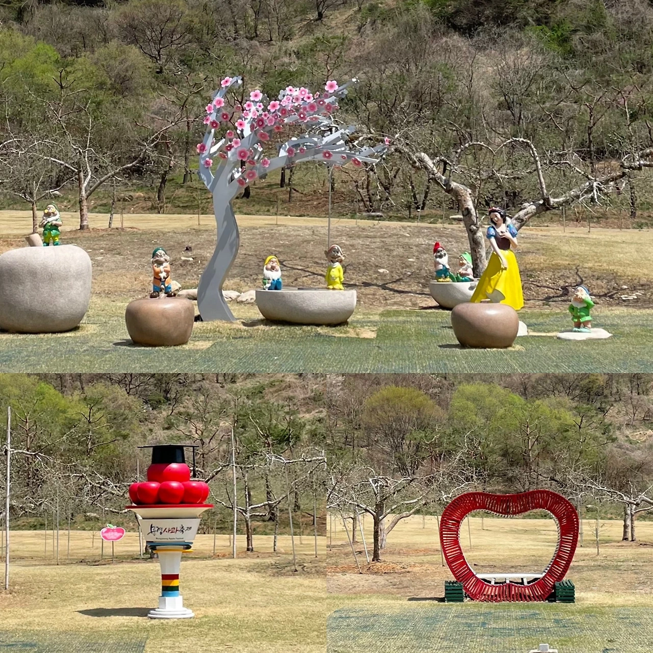 5시간 정도 걷는 걸음마다 마음이 씻기는 기분의 문경새재 산책. 완벽하지 않은 어색함에도 웃어넘길 여유가 있었다. 입구에 백설공주와 일곱난쟁이? 아니 문경새재에 왜?? 설마 사과? 옆에 사과 조형물이 이어진다. 아니 백설공주의 사과는 독사과였는데ㅎㅎ