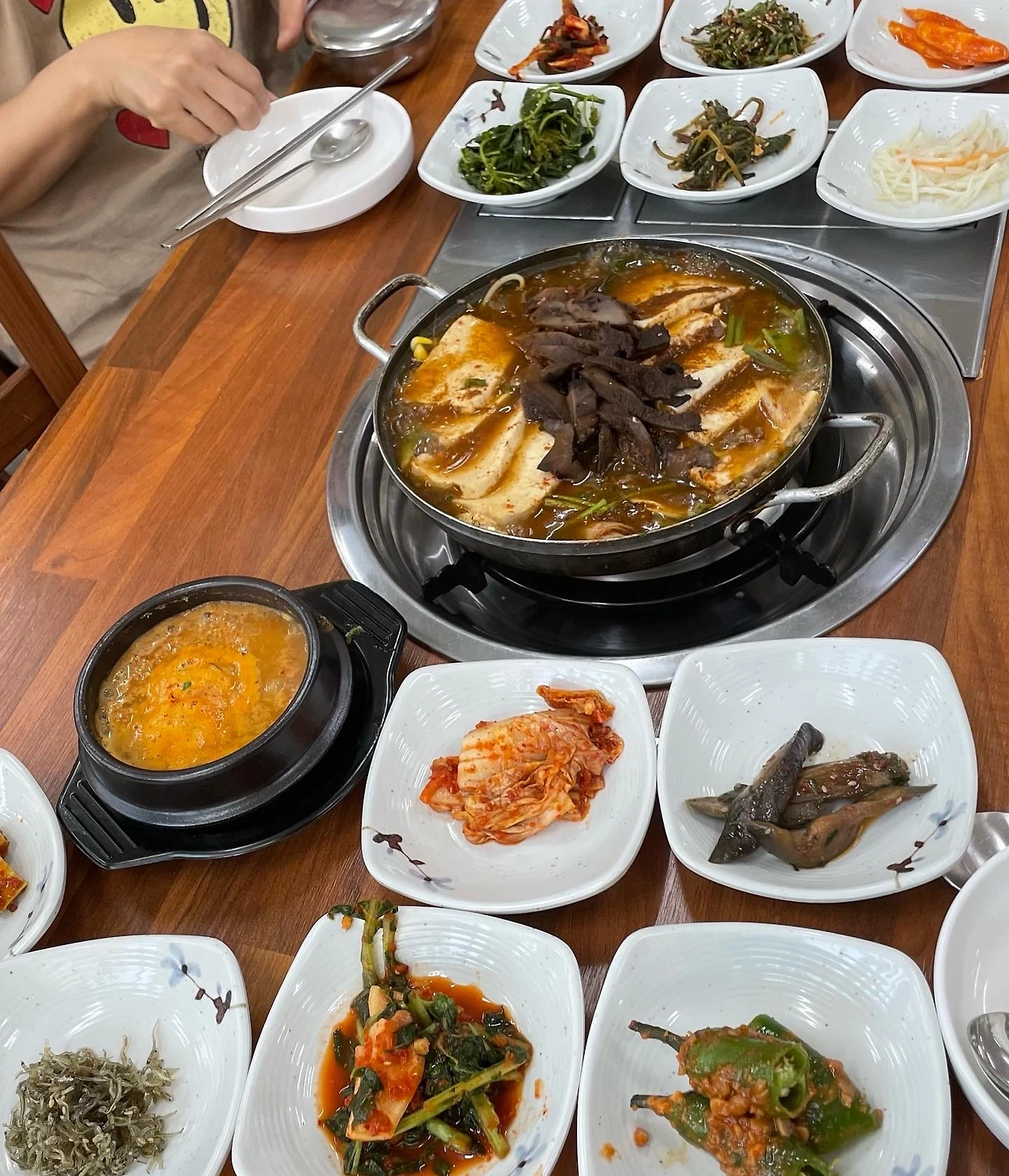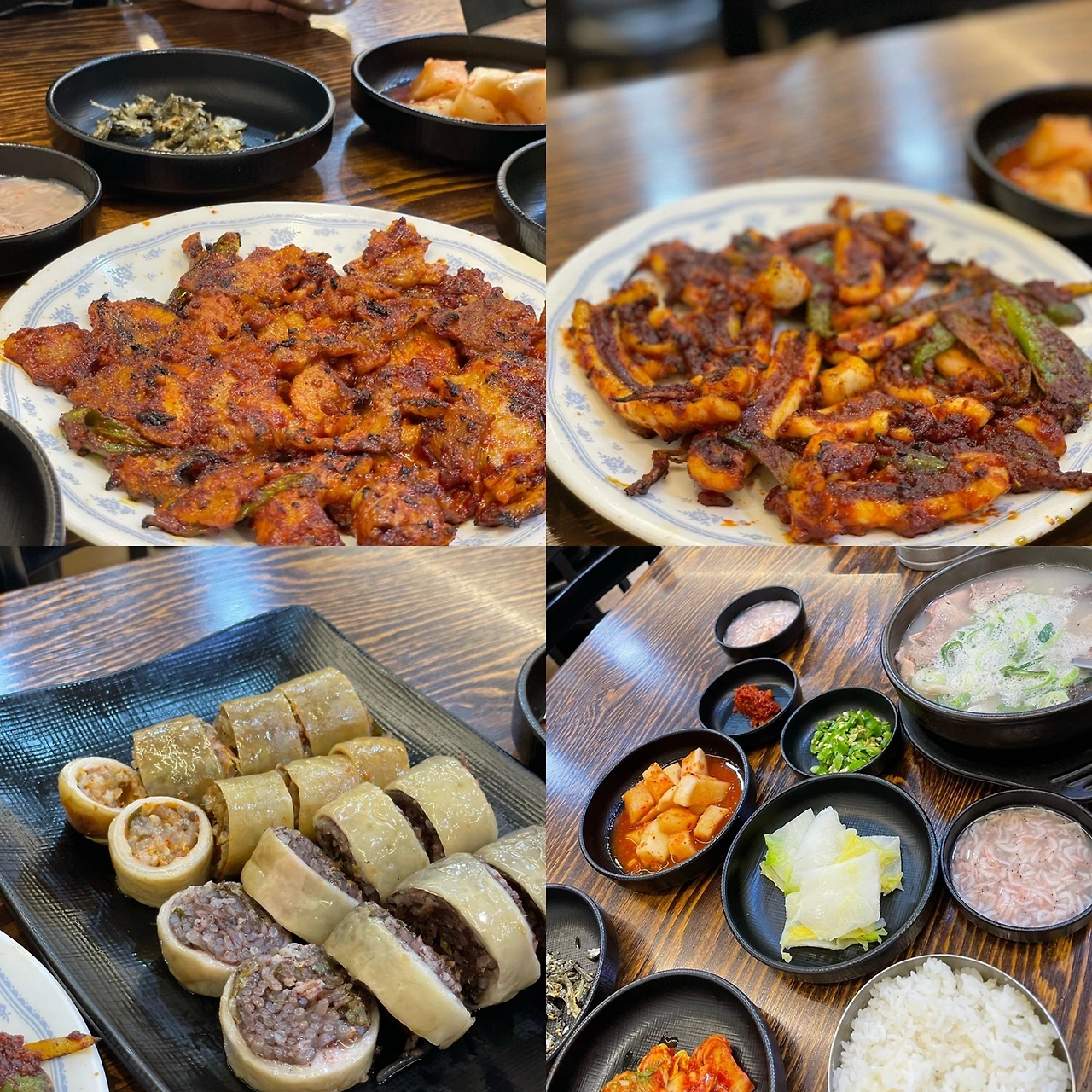 점심은 예천에서 문경가는 부근의 용궁. 온동네가 순대 마을이다. 마침 검색한 #용궁단골식당 갔더니 백종원쌤 사진! 벽 하나가 유명인사들 사인이다. 따로살코기국밥(8000) 한그릇만 시키고 각 1.1만원인 모듬막창순대, 오징어불고기, 돼지불고기. 순대 즐기지 않는다는 O선배도 기꺼이 드신 순대는 막창껍질이라 꼬숩다. 매콤 불고기들은 밥도둑이고 국도 싹싹 비웠다. #마냐먹방 이번 여행도 흡족하다.