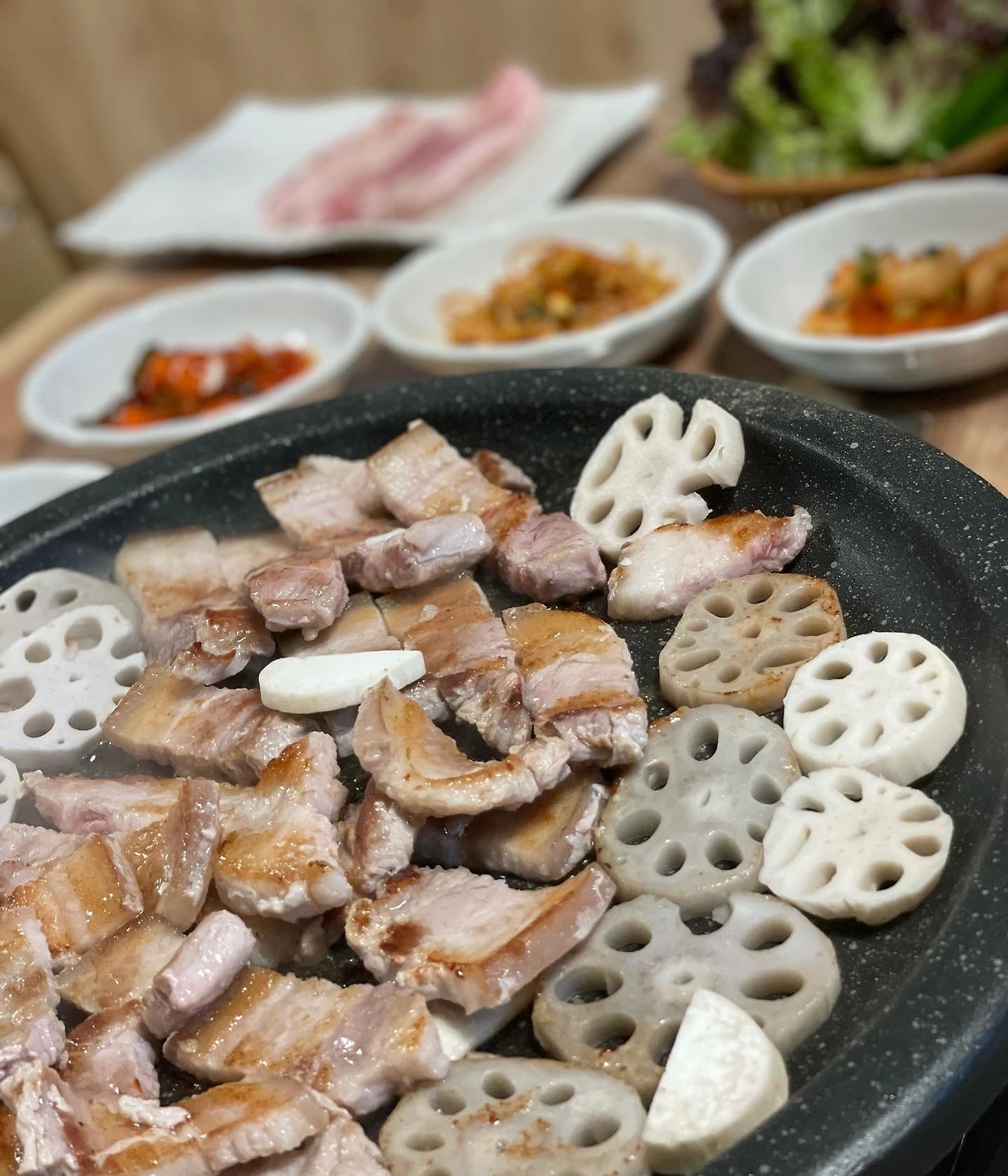 저녁 식당은 숙소 부근 검색해 4분 거리 #좋은연. 삼겹살인데 연잎가루를 뿌리고, 연근을 함께 굽는다. 200g 1만원 삼겹살도 상태 좋지만 연근과 버섯 무한리필. 노릇하게 구운 연근과 함께라면 삼겹살도 살찌지 않는다고 믿으며..