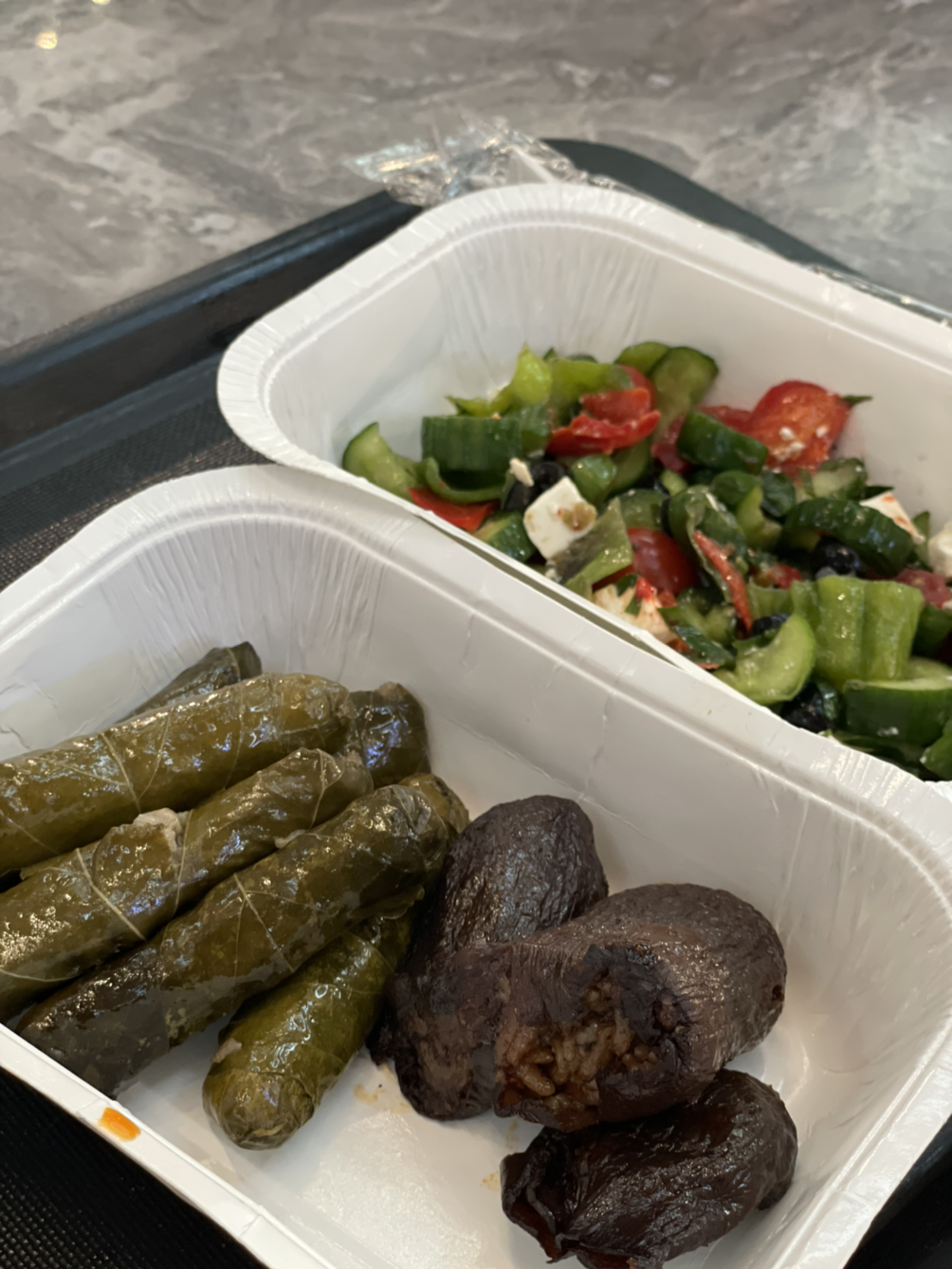 우리의 트랜짓 나들이 계획은 무산됐지만, 대신 딸기는 내게 아침을 샀다. 포도잎에 쌀과 양파 등을 버무려 찐 음식 돌마(Dolma)는 꽤 맛있다. 중앙아시아와 서아시아, 남동유럽의 음식으로 채소나 해산물 속에 쌀이나 다른 곡물, 다진 고기, 양파, 허브 등을 채워 만든단다. 가지 돌마도 괜찮은데 좀 따뜻했다면 좋았겠다. 샐러드는 쏘쏘. 평소 토마토와 오이가 몹시 신선해 오일만 더해도 맛있다는데, 공항의 음식이란. 원래 인천공항의 육개장도 부민옥보다 못한게 아니던가.