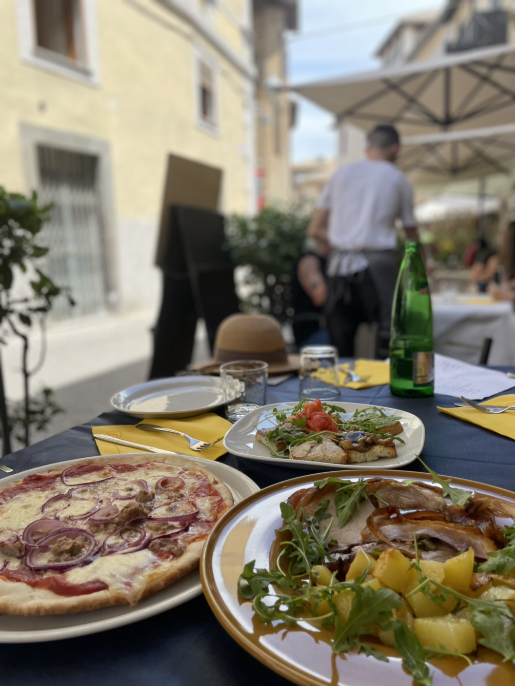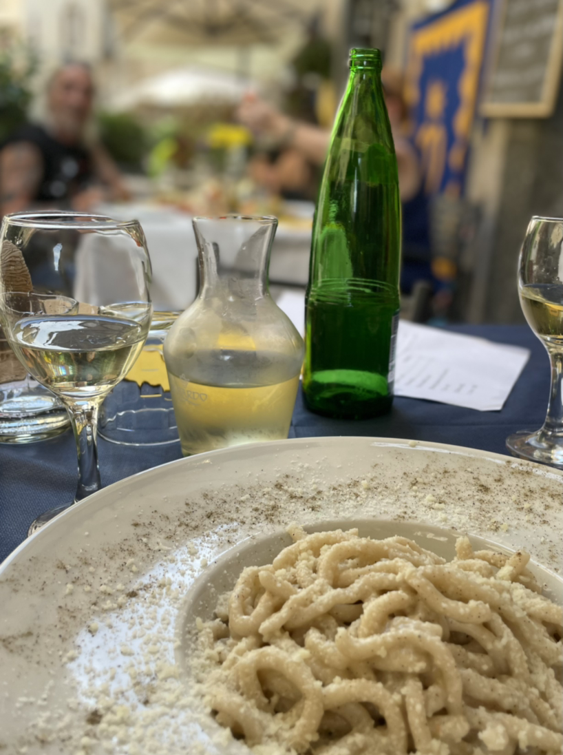 점심은 오르비에토 방식으로 숙성한 뭔가를 먹고 싶었다. 점찍어둔 식당에 한국 아저씨들이 있길래 우리는 괜히 피했다. 편하게 수다를 떨어야지. 15유로에 포르게타(돼지고기)와 감자, 브루케스타와 파스타 셋트가 있다. 각 셋트마다 와인 1/4병이 기본. 10유로 피자 하나 추가하고 와인 반 병을 느긋하게. 페친 추천에 따라 치즈파스타인 카치오에페페를 즐겨 먹는데 딸기 말을 빌리면 우동 사리 같은 저 면은 이 동네 전통면일까?