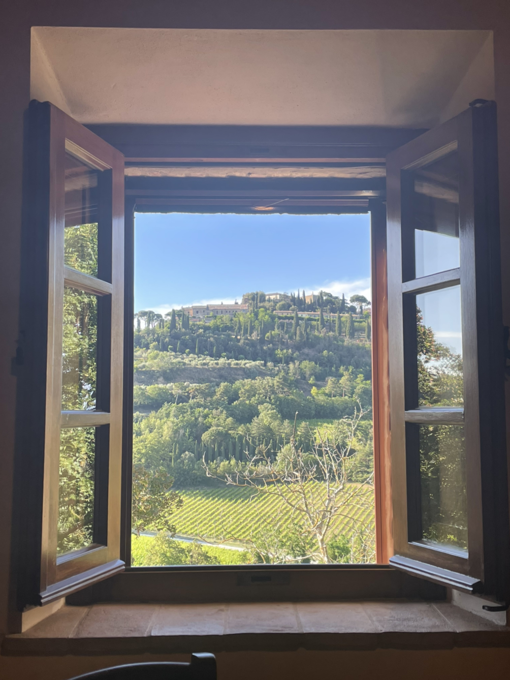 이 글을 정리하는 부엌 창문뷰.. 멀리 보이는 몬테풀치아노는 6일차 일기에 쓰겠다.