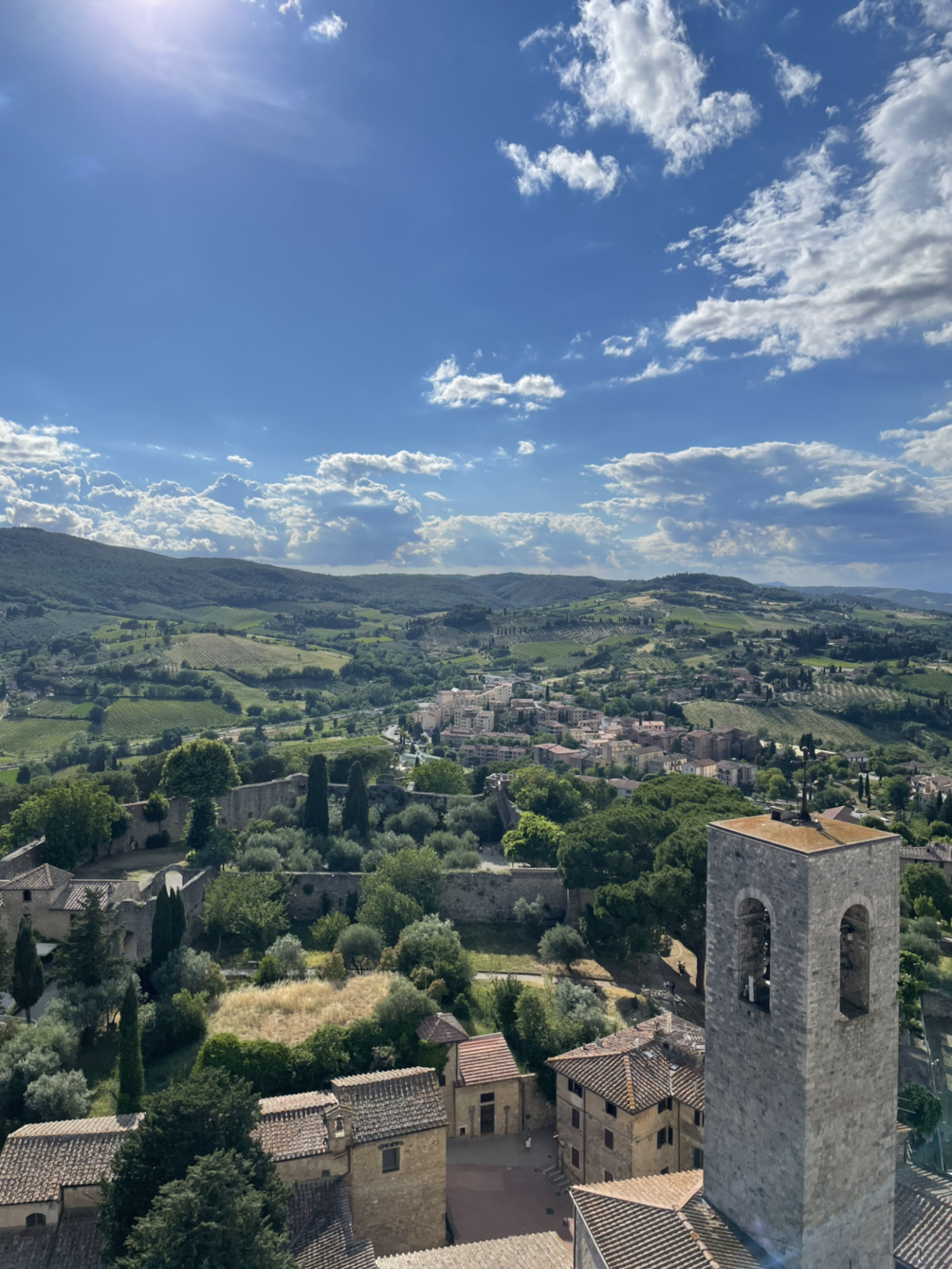 우리가 시에나 일정을 서두른 건 산 지미냐노 San Gimignano. 탑의 도시란다. 13세기엔 분명 전성기였다는데, 교황파와 신성로마 황제파로 나뉘어, 가문끼리 파벌끼리 권위의 상징인 탑 올리는데 열 올렸고.. 70여개 탑을 올렸다가 지금 남은게 12개? 13개? 하여간에 지들끼리 싸우다가 쇠락한 도시란다...역사는 그렇다치고.. 그로사탑, Torre Grossa 을 올라가야 한다. 올라가시라... 그냥 토스카나의 하늘과 평원이 그림처럼 아름답다. 그냥 혼이 나갈 만큼 멋있다. 다만... 계단은 가파르고.. 옥상에선 바람이 몹시 불어, 하마트면 '7년만의 외출' 찍을 뻔.. 원피스 자락 잡고 다니느라 힘들었....