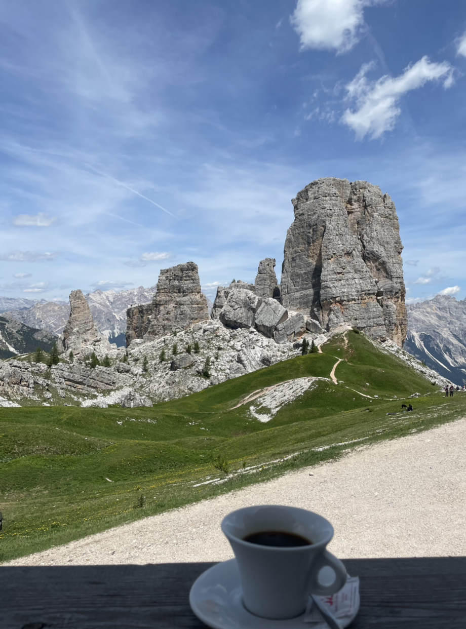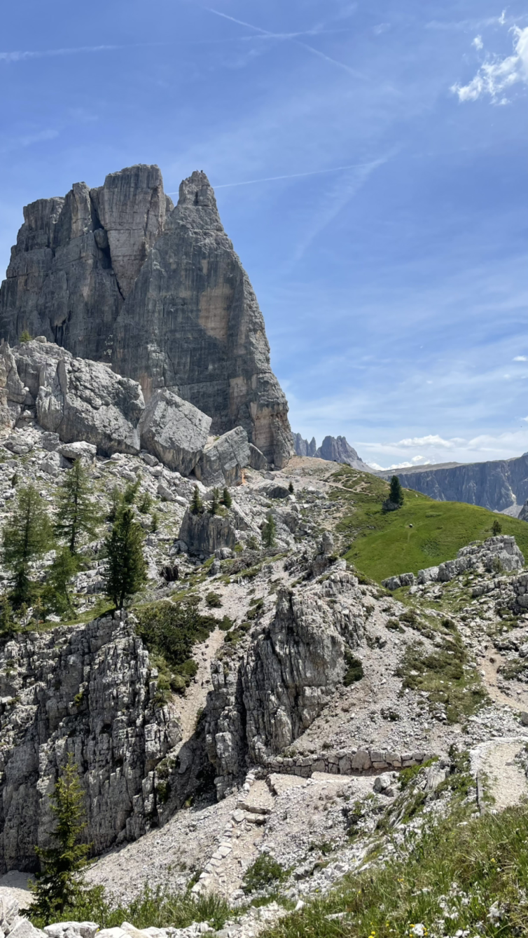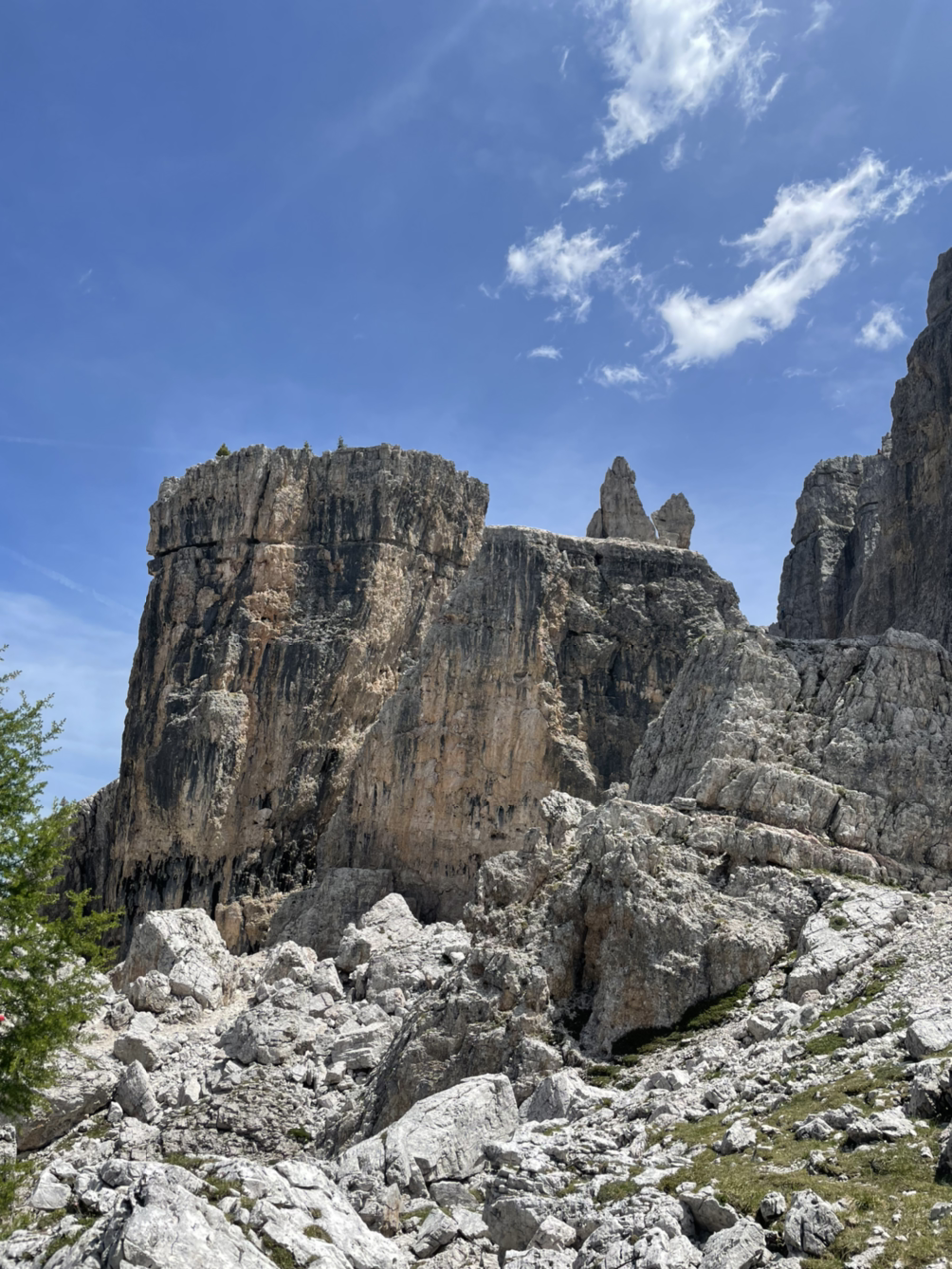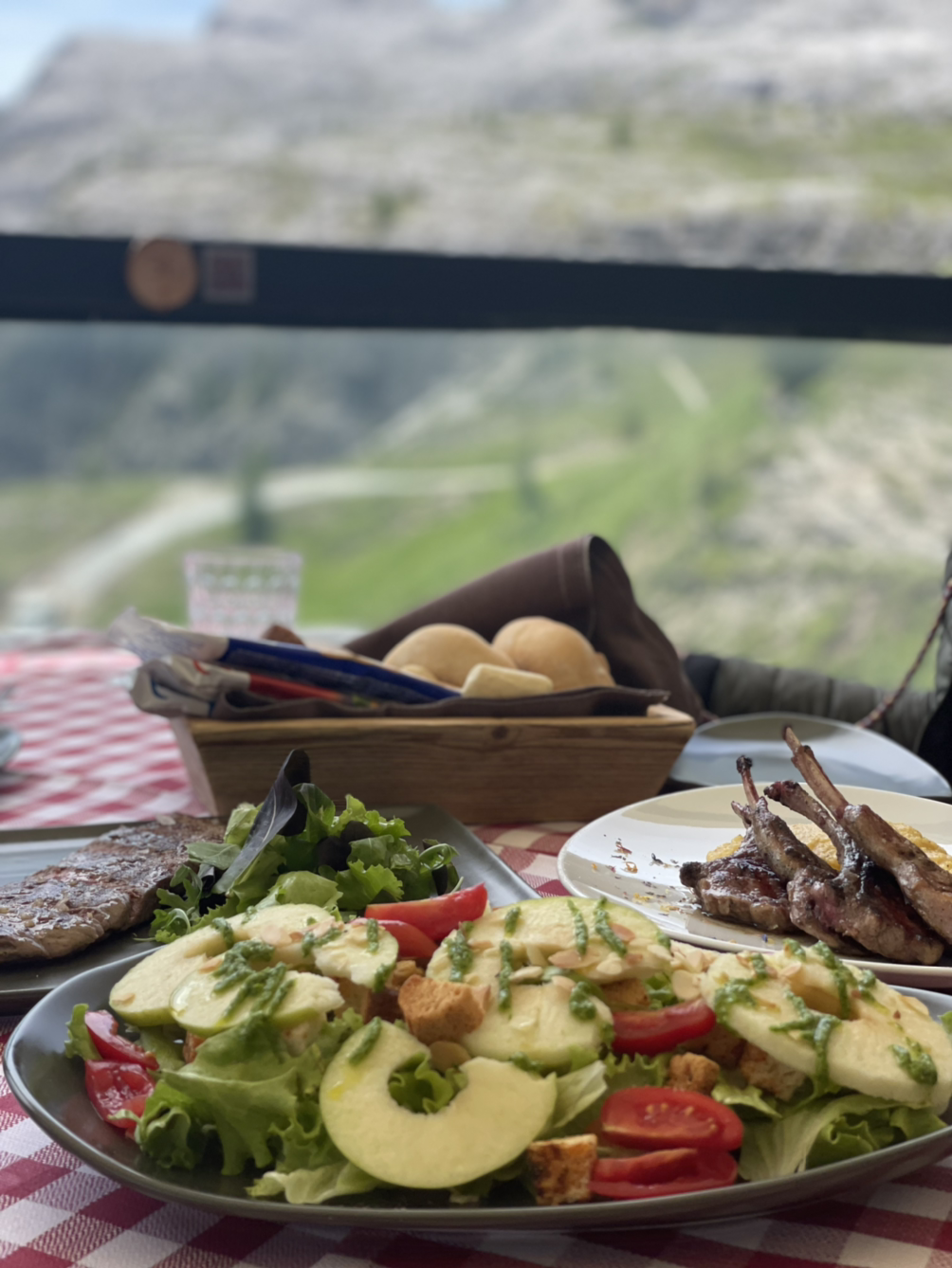 길 위에서 만난 파소 셀라 외에 오늘 우리의 유일한 목적지는 친퀘토리 Cinque Torri. 다섯 개의 봉우리다. (탑을 torre 라 하던데 같은 단어일까?) 20유로에 곤돌라를 타고 올라가 점심부터 먹었다. 2600m 산 봉우리들 틈에서 밥 먹는 정도는 하루만에 익숙해졌다. 사과 샐러드와 양고기 굿굿.