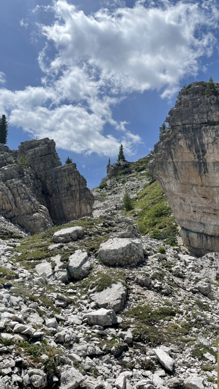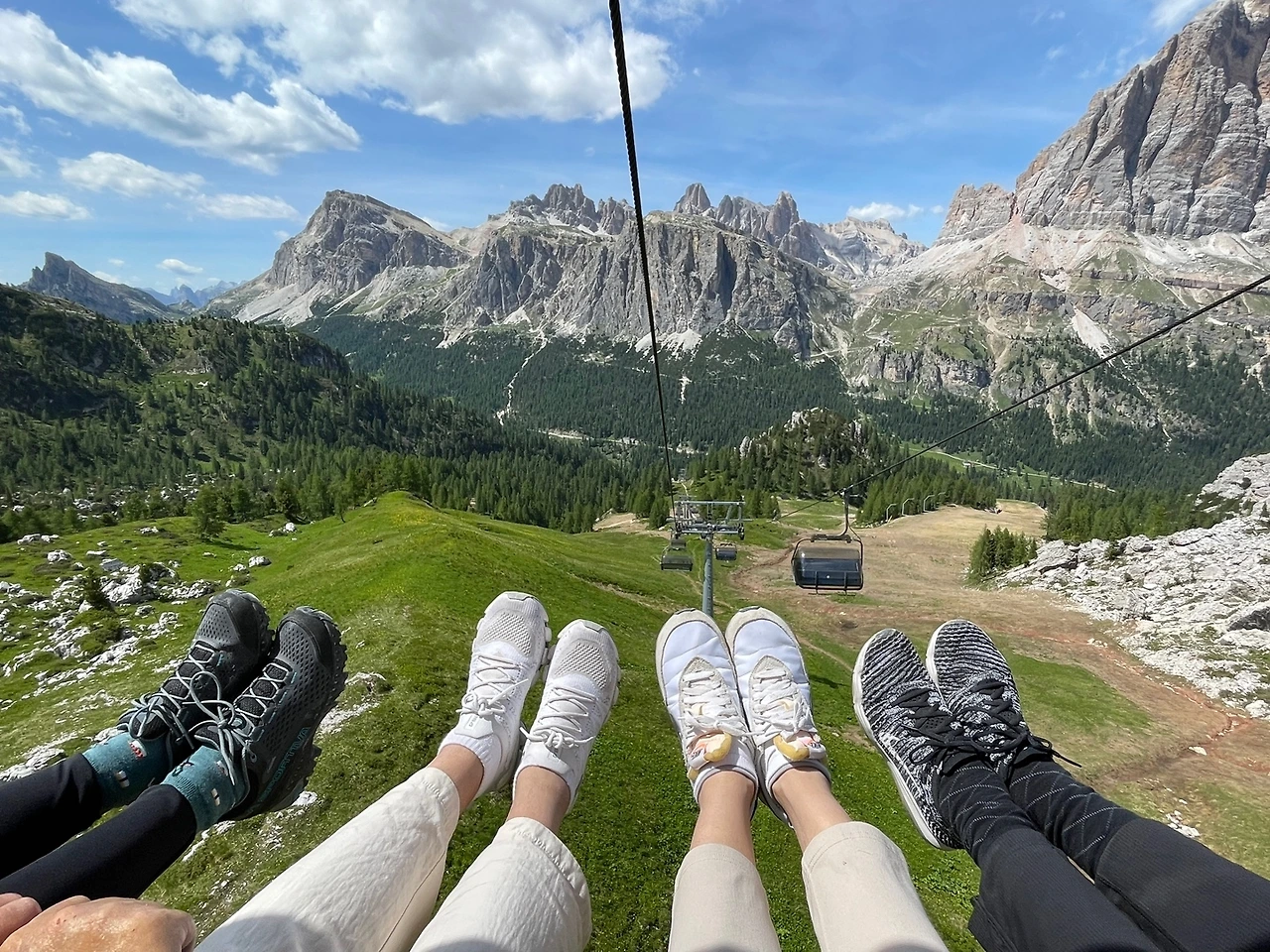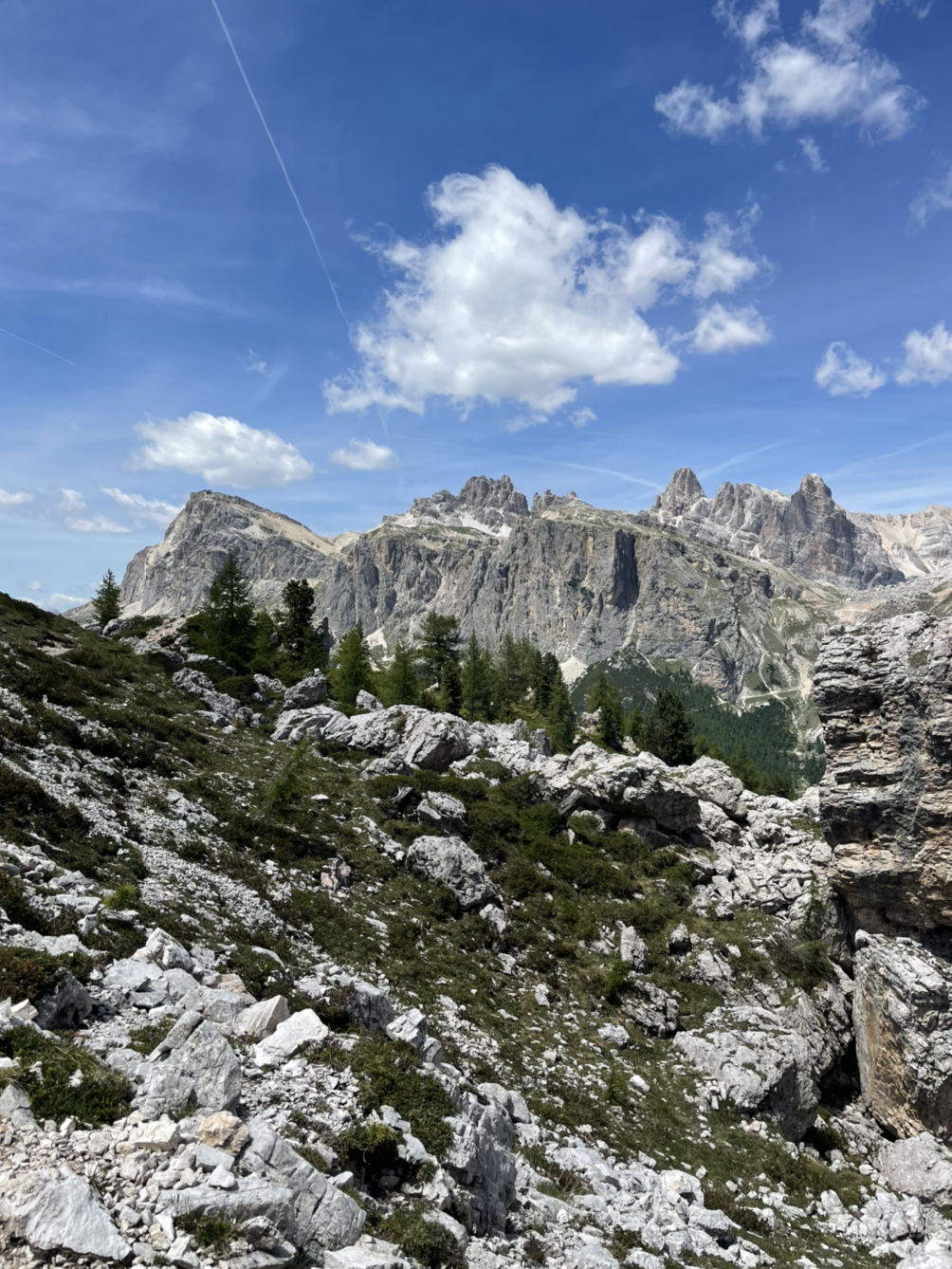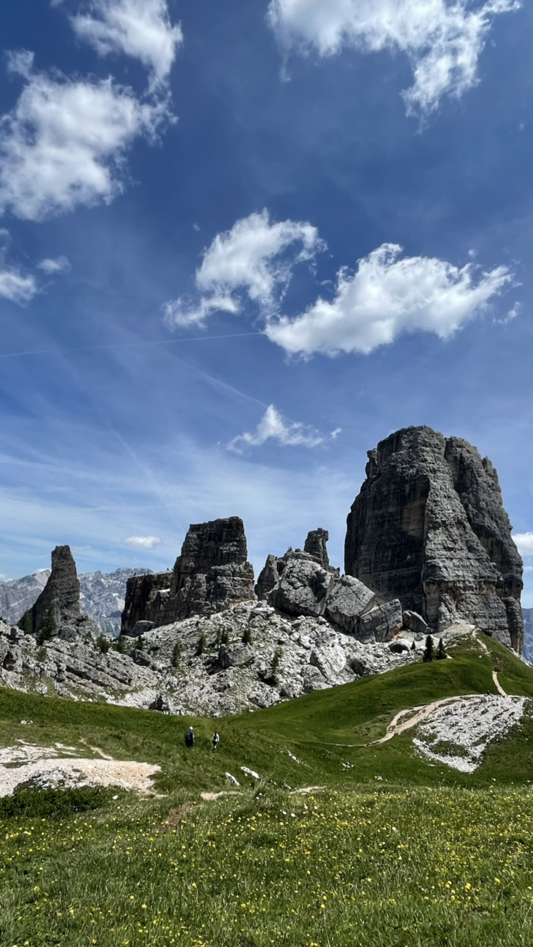 길 위에서 만난 파소 셀라 외에 오늘 우리의 유일한 목적지는 친퀘토리 Cinque Torri. 다섯 개의 봉우리다. (탑을 torre 라 하던데 같은 단어일까?) 20유로에 곤돌라를 타고 올라가 점심부터 먹었다. 2600m 산 봉우리들 틈에서 밥 먹는 정도는 하루만에 익숙해졌다. 사과 샐러드와 양고기 굿굿.