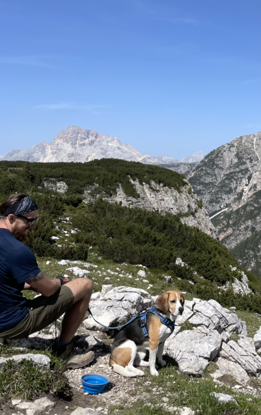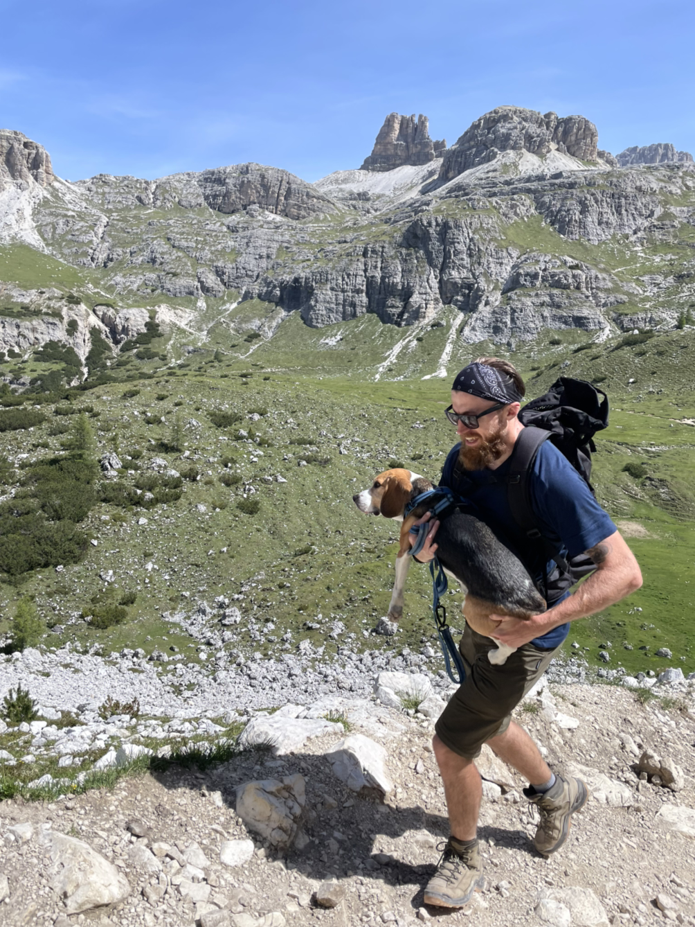 우리는 101번 길을 따라 트레치메 포스트까지 가서 실컷 세 봉우리를 감상했다. 막판에 오르막이 있지만 아주 힘들지 않다. 돌아가는 105번 길은 일단 협곡 바닥까지 간다. 오르막도 힘들지만 내리막길이 엄청 가파르다. 105번부터 올 경우, 고생길이란 얘기다. 105번 올라가는 길은 내 저질엔진으로는 헉헉... 그런데 나만 그런게 아니란게 위안이 된다. 저 강아지는 지친 눈빛으로 주인 품에 안겨 오르고 있더라. 정말 많은 개들을 만났는데 침을 흘리며 힘들다는 표정이 역력했다. 그나마 쟤는 덩치가 작아서 주인 덕을 봤고.. 능선에서 주인과 쉬고 있더라. 몹시 귀엽긴 했다. 혼자 걷기도 슴차는데 저 주인도 상대를 사랑하는구나.