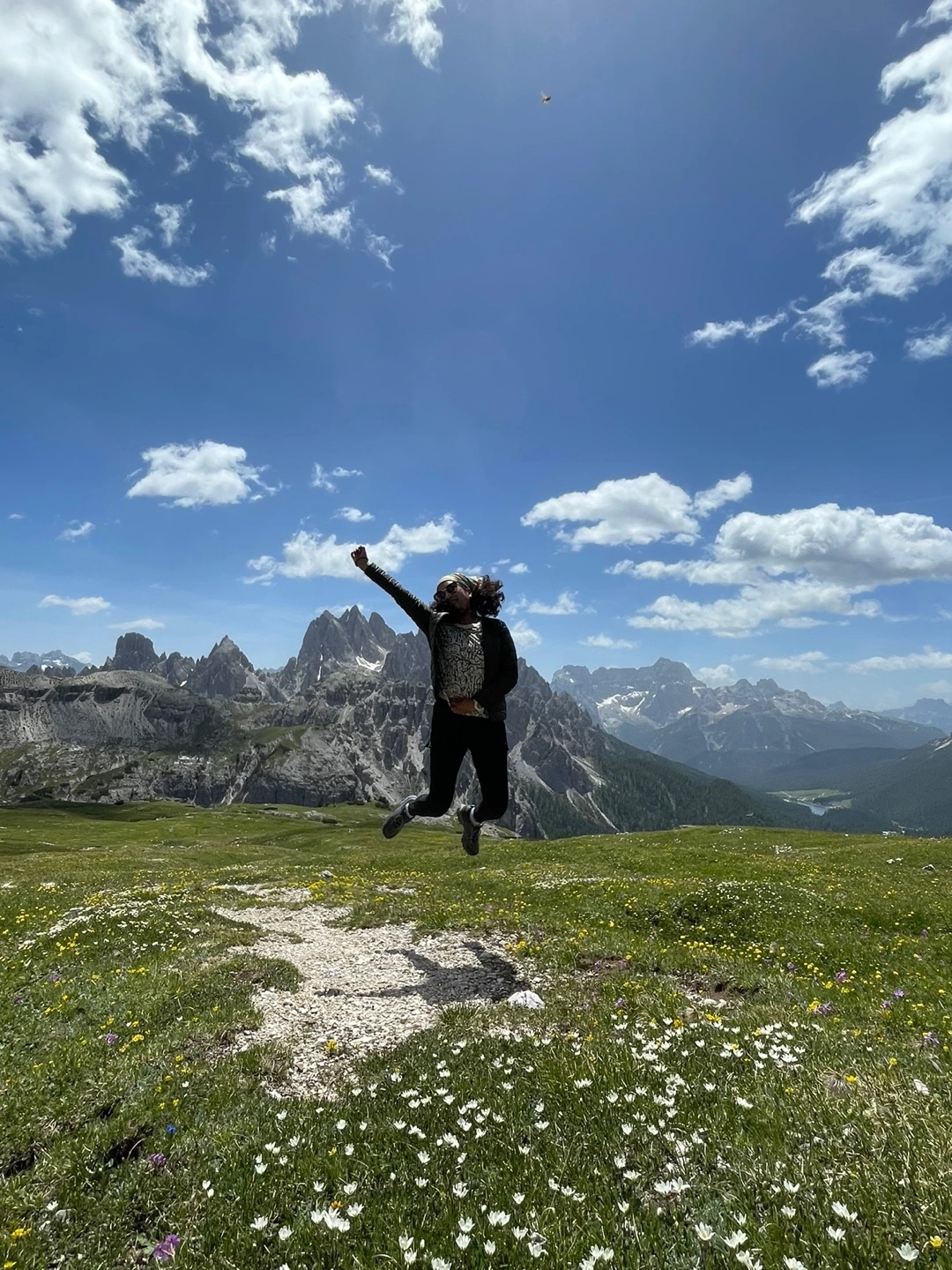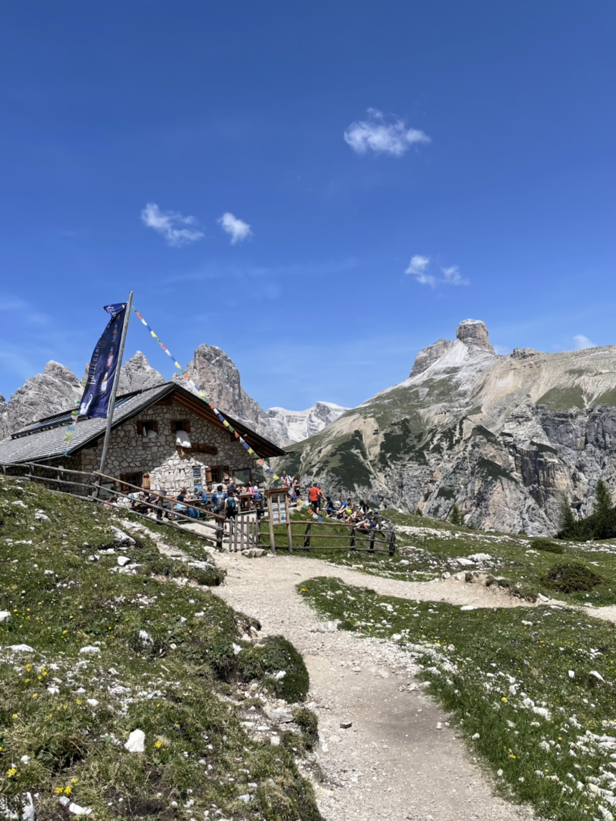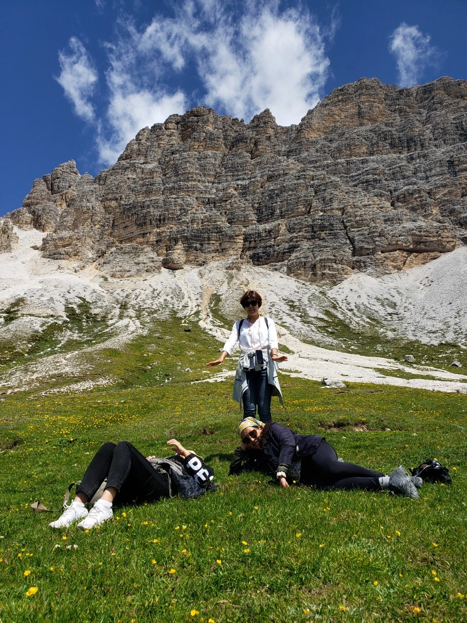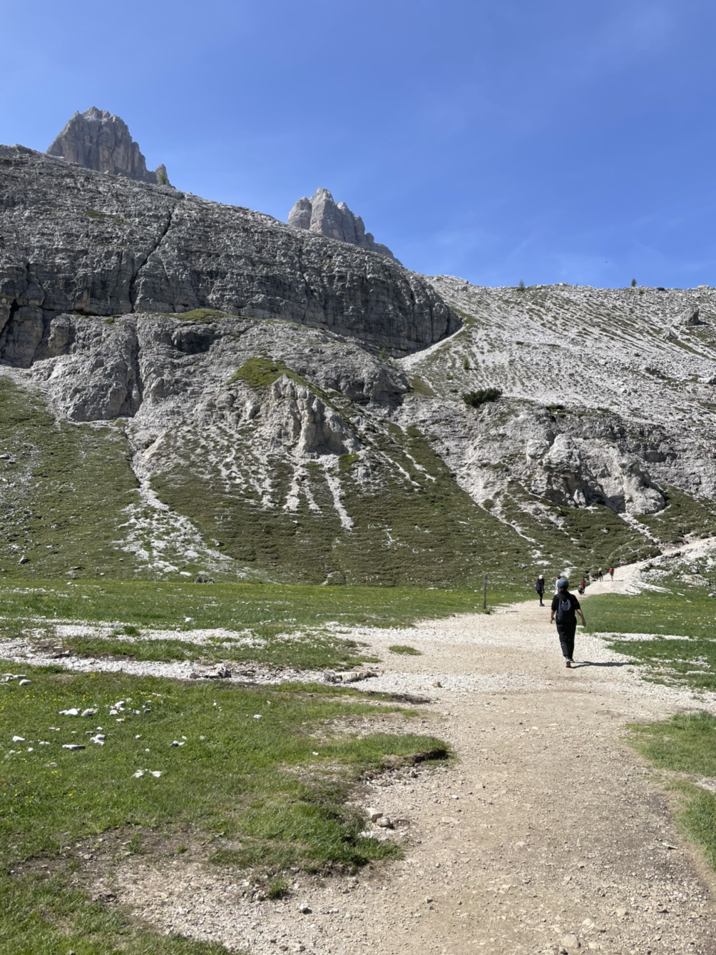 아직 세 개의 봉우리는 잘 보이지 않는다. 왼쪽에 거대한 석벽이 있는데, 알고보니 그게 트레 치메의 일부였다. 대신 오른쪽 절경의 색깔이 달라진다. 어느새 초록이 가득하고, 들꽃이 한창이다. 이 찐한 사진은 연의 것을 빌려왔다. (갤럭시가 아이폰보다 색감은 좋다)
