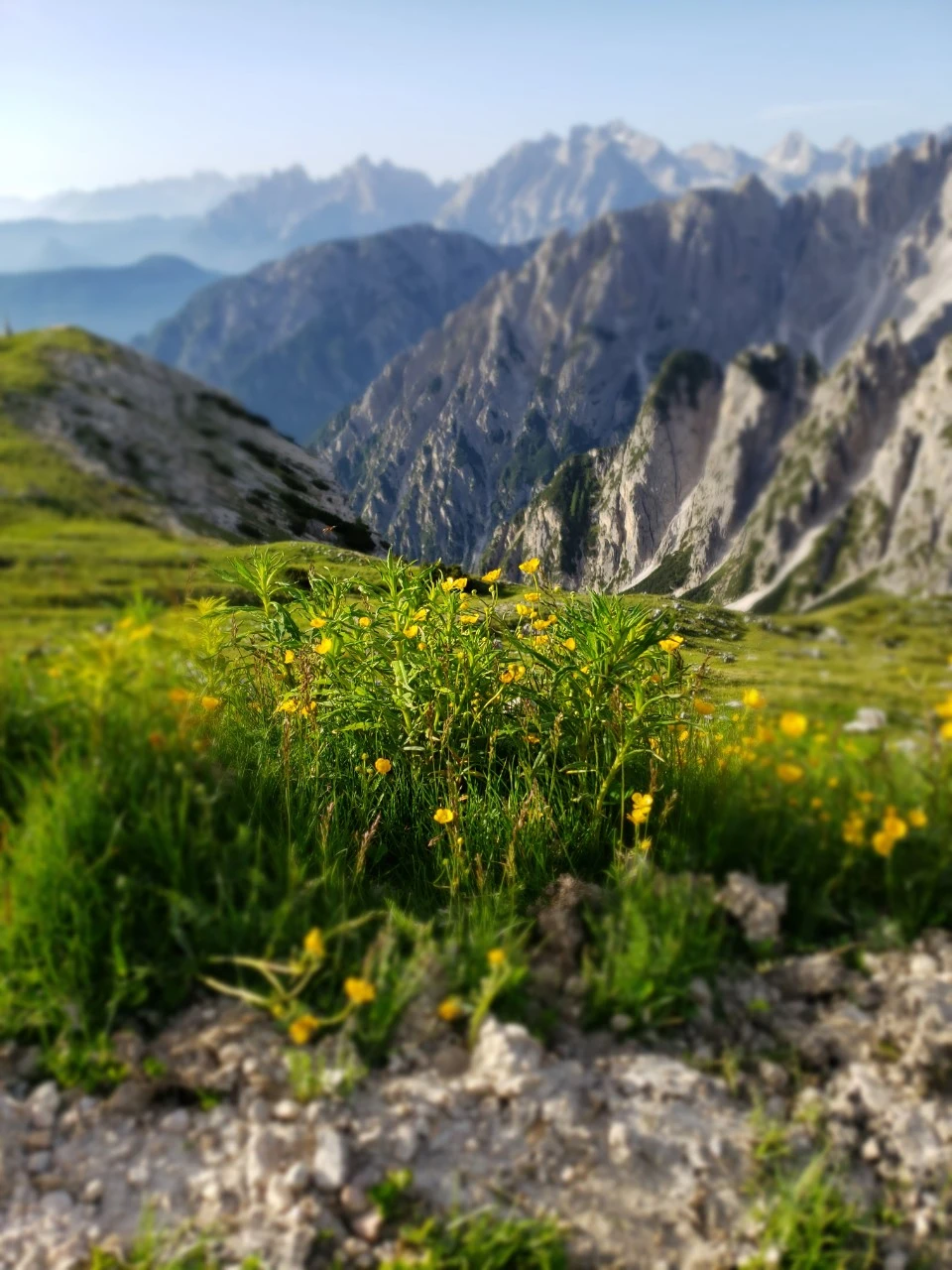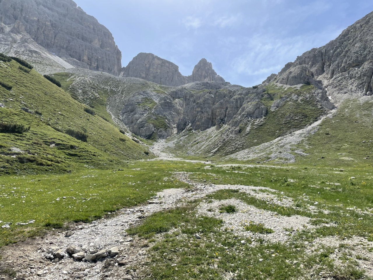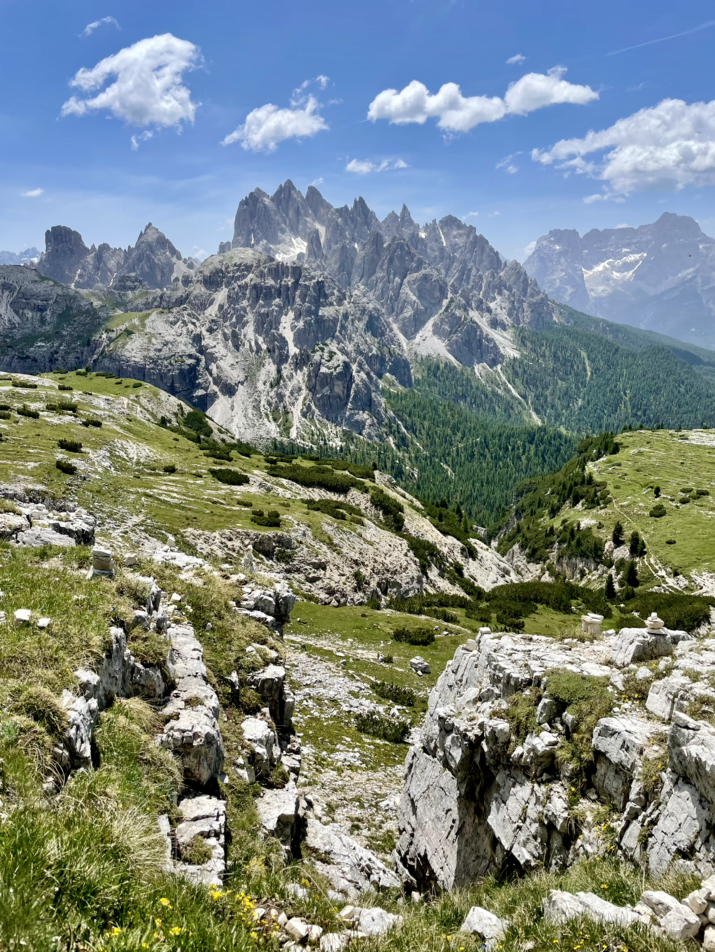 아직 세 개의 봉우리는 잘 보이지 않는다. 왼쪽에 거대한 석벽이 있는데, 알고보니 그게 트레 치메의 일부였다. 대신 오른쪽 절경의 색깔이 달라진다. 어느새 초록이 가득하고, 들꽃이 한창이다. 이 찐한 사진은 연의 것을 빌려왔다. (갤럭시가 아이폰보다 색감은 좋다)