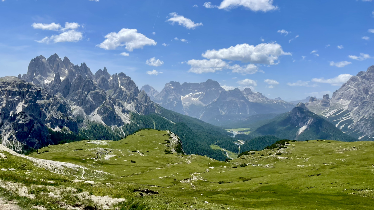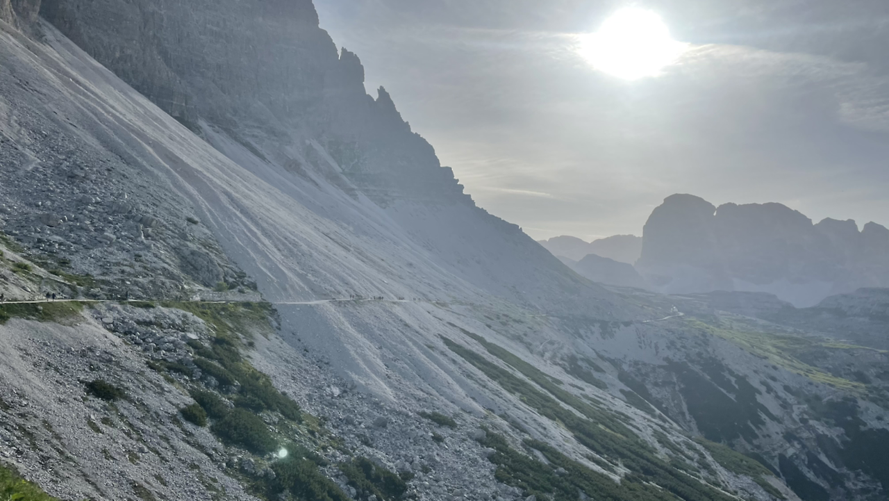 우리는 101번에 이어 돌아가는 길로 105번을 택했다. 맞은편 풍경이 달라지기 시작한다. 이때까지만 해도 좋았다. 나는 아래로 내려가는 걸 좋아하지 않는다. 기껏 확보한 고도를 낮추면 올라가는게 힘드니까. 가는 길은 감당할 수 있을 만큼 오르락내리락 했다. 괜찮았다. 하지만 2400m 트레 치메 고지를 찍고 난 뒤가 문제였다. 설마 했는데 내리막길이다.