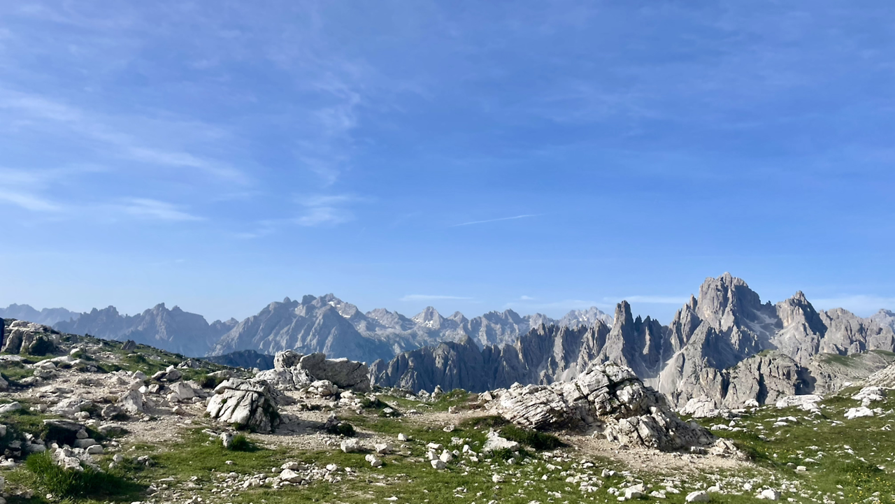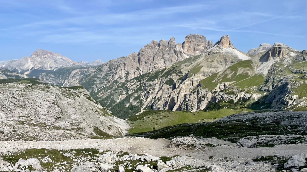 오르막을 또 한 고비 넘었더니 갑자기 새로운 풍경이 펼쳐진다. 여기가 트레치메란 이름이 붙어서 그렇지, 사실 가장 아름다웠다. 주인공은 여기였단 말인가? 왼쪽의 바위는 날카롭게 하늘을 찌르며 모여있었다. 저 멀리 능선은 미지의 아스라함을 보여줬고, 오른쪽의 돌산.. 앞쪽의 평원이 조화롭게 어우러졌다. 맘 같아서는 저 평원을 달려가보고도 싶지만.. 이때쯤은 거의 말미. 체력 소진... 그래도 걷는 길은 가슴이 쿵쾅댈 정도로 멋졌다.