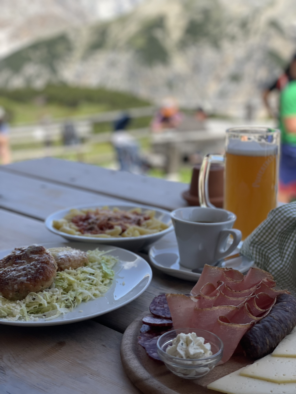 오전 7시30분부터 올랐는데.. 12시쯤 세번째 산장에서 점심을 먹었다. 첫 산장은 출발점에 있고, 두번째는 문을 닫아 커피 한 잔 기대가 무산됐다. 세번째 산장에는 사람들이 많았다. 덤플링이라는데 약간 동그랑땡 맛. 사우어크래프트, 양배추 절임이 훌륭했다. 연은 맥주를, 우리는 커피를 마셨다. 살 것 같더라. 파스타와 덤플링, 햄치즈 플레이트에 네 명의 마실것 까지 55유로. 사람 구경, 그들이 데리고 온 개 구경, 풍경 구경.. 무엇보다 잠시 쉬었다.