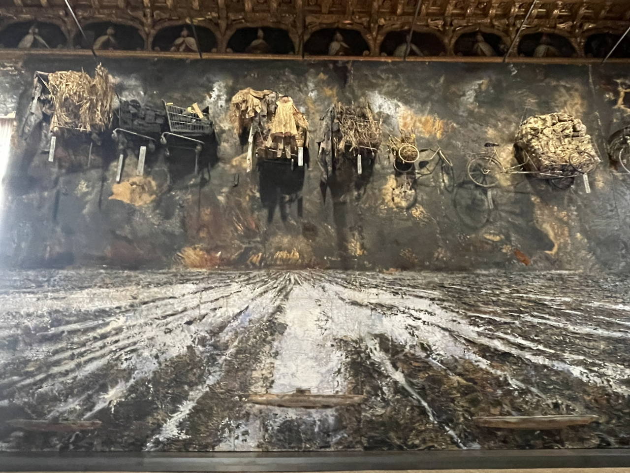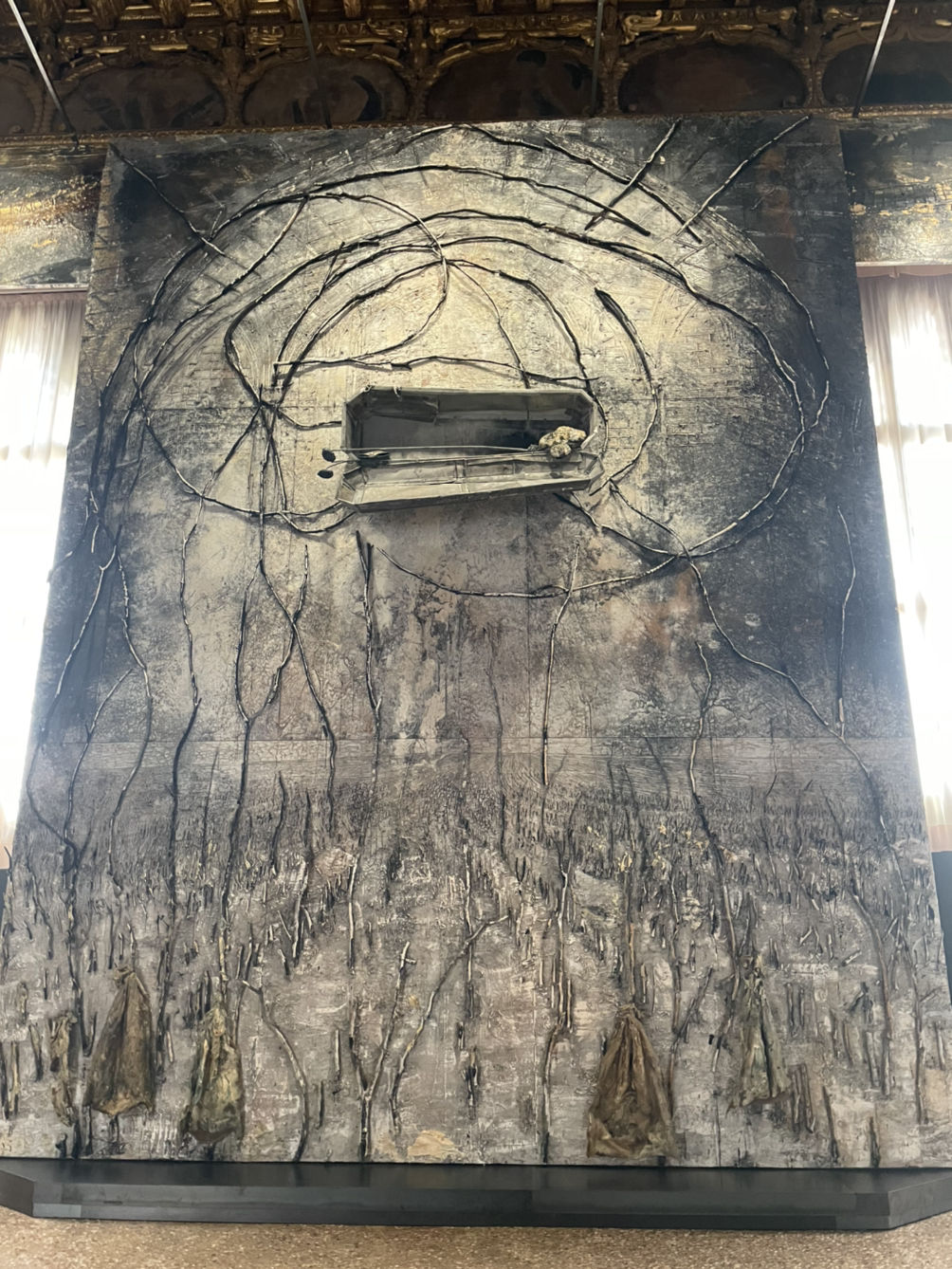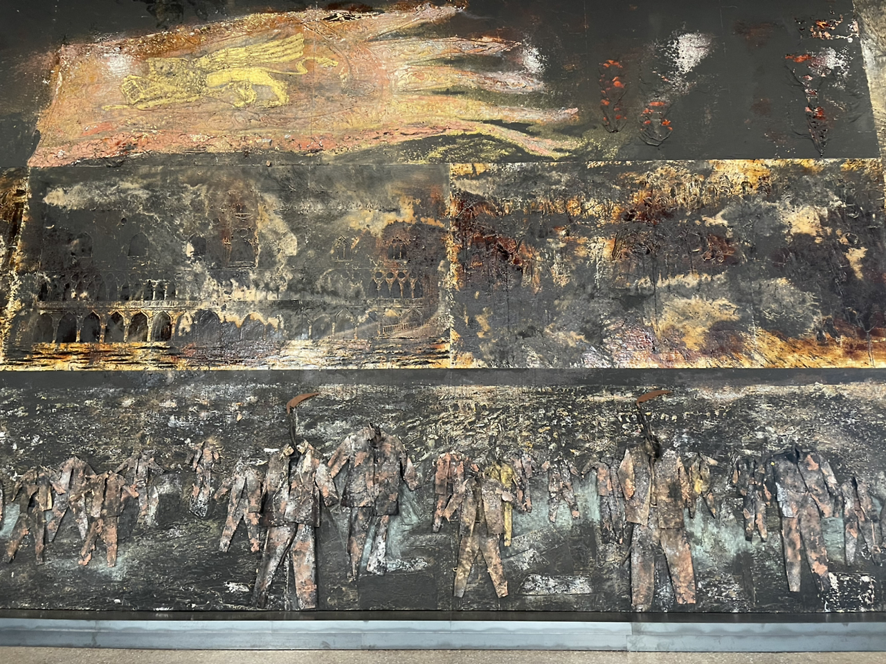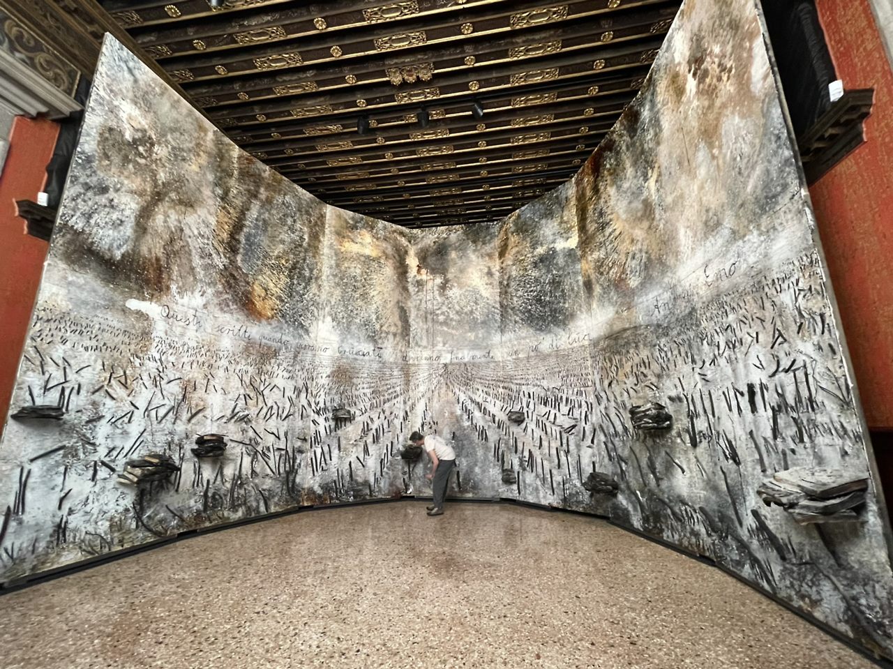 그 다음 방에선 숨이 막혔다. 그제서야 부랴부랴 검색하기 시작했다. 독일의 미술가 안젤름 키퍼 Anselm Kiefer. 거대한 작품이 벽을 가득 채웠다. 불에 타버린 거대한 잔해는 잿빛으로 처연했다. 신발은 쓸쓸하게 붙어있고, 작업복들은 슬프다. 벽에 붙어있는 관과 쇼핑카트는 그로테스크하다. 이게 뭐지? 알고보니 이 전시의 제목은 '이 글이 다 타버리고 나면 마침내 약간의 재만 남으리라'. 베네치아 1600주년 기념 작품이라는데 이렇게 슬퍼하기를 기대한걸까? 베네치아에도 잊지 말아야 할 시간들, 사연들이 있겠지? 아. 진짜 이 전시 구경만으로도 값진 시간이다. 두칼레에 홀린 시간도 안젤름 키퍼에게 빠진 시간도 순식간에 마법의 순간처럼 다가왔다.