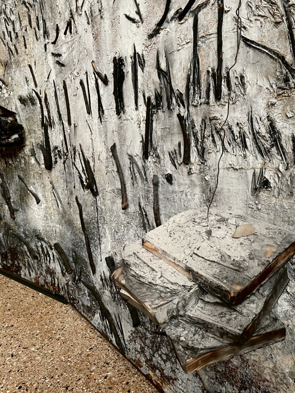 그런데 놀랍게도, 그 다음 방에서 더 압도당했다...저 화려하고 웅장하고 권세를 자랑하는 역사적 증거물들보다 더 처연하게 아름다운 작품 앞에 당황했다. 먼저 작은 방. 이게 뭐지? 정말 사전정보 없이 들어온 덕분에 놀라움이 컸다. 타버린 책이 작품에 붙어있다.