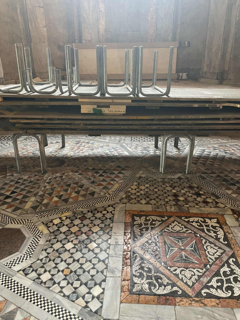 가장 멋진 곳마다 가림막이라니 이것도 아쉽다. 베로나의 성당은 수리하는 장면도 공개해 좋았는데. 이탈리아 다른 성당에서는 어디든 고풍스런 나무 의자에 앉아 잠시 경건해질 수 있었는데, 여긴 의자도 막아놓았다. 그것도 간의의자. 바닥조차 아름다운데 온갖 집기가 영문 모르고 놓여있다. 한국 같으면 민원이 쏟아질 상황이다. 너무 멋진 성당인데 그 느낌을 다 얻지 못해서 괜히 심술.