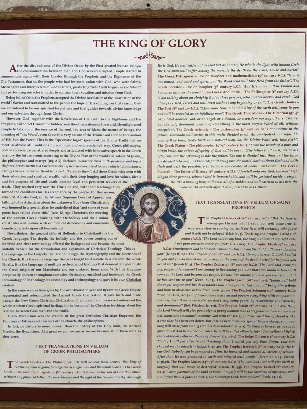 매우 인상적인 그리스 철학과 기독교의 만남. 왼쪽에서 세번째 삼각형을 들고 있는 이는 피타고라스, 그 오른쪽은 소크라테스, 오른쪽에서 두번째 세번째는 플라톤과 아리스토텔레스다. 당신들이 거기서 왜 나와. 알고보면 피타고라스는 B.C. 5세기에 "God is nous(mind) and word and spirit, and the Word who woll take flesh from the father"라 말했고, 소크라테스는 "And his name will be knowm and honoured all over the world".. 아리스토텔레스는 B.C 4세기에 "Sometime in the future, somebody will arrive in this multi-divided earth...플라톤은... 아아. 이거 보다가 살짝 당황했다. 이게 후대의 해설인걸까.