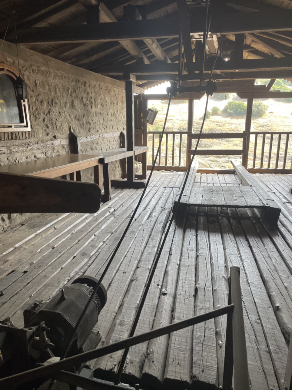 예전엔 저 베란다로 밧줄을 내렸고, 사람과 물자를 끌어올렸단다. 오늘날에는 케이블카로 운송한다. 관광객 용도는 아니고 수도원의 실제 수요용. 오른쪽 사진은 멀리서 찍어 잘 보이지 않지만 놀이동산에서 볼듯한 모습이다.
