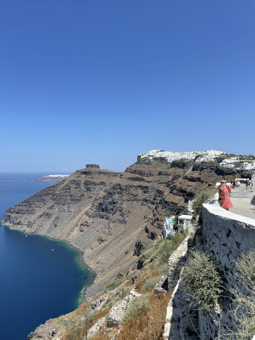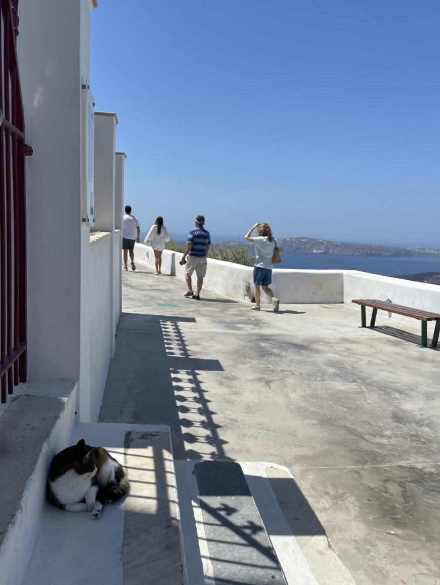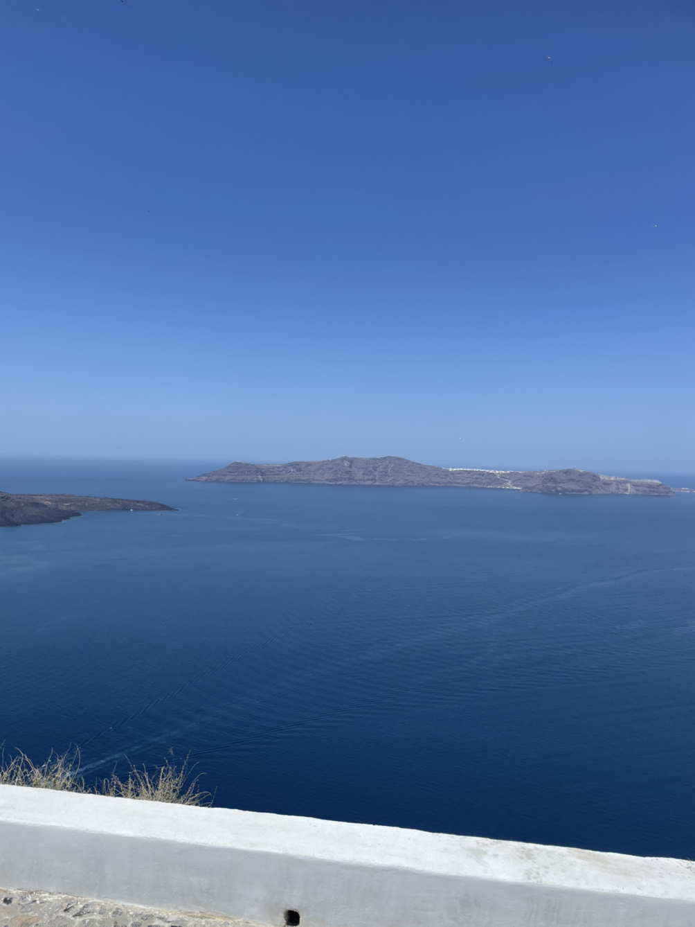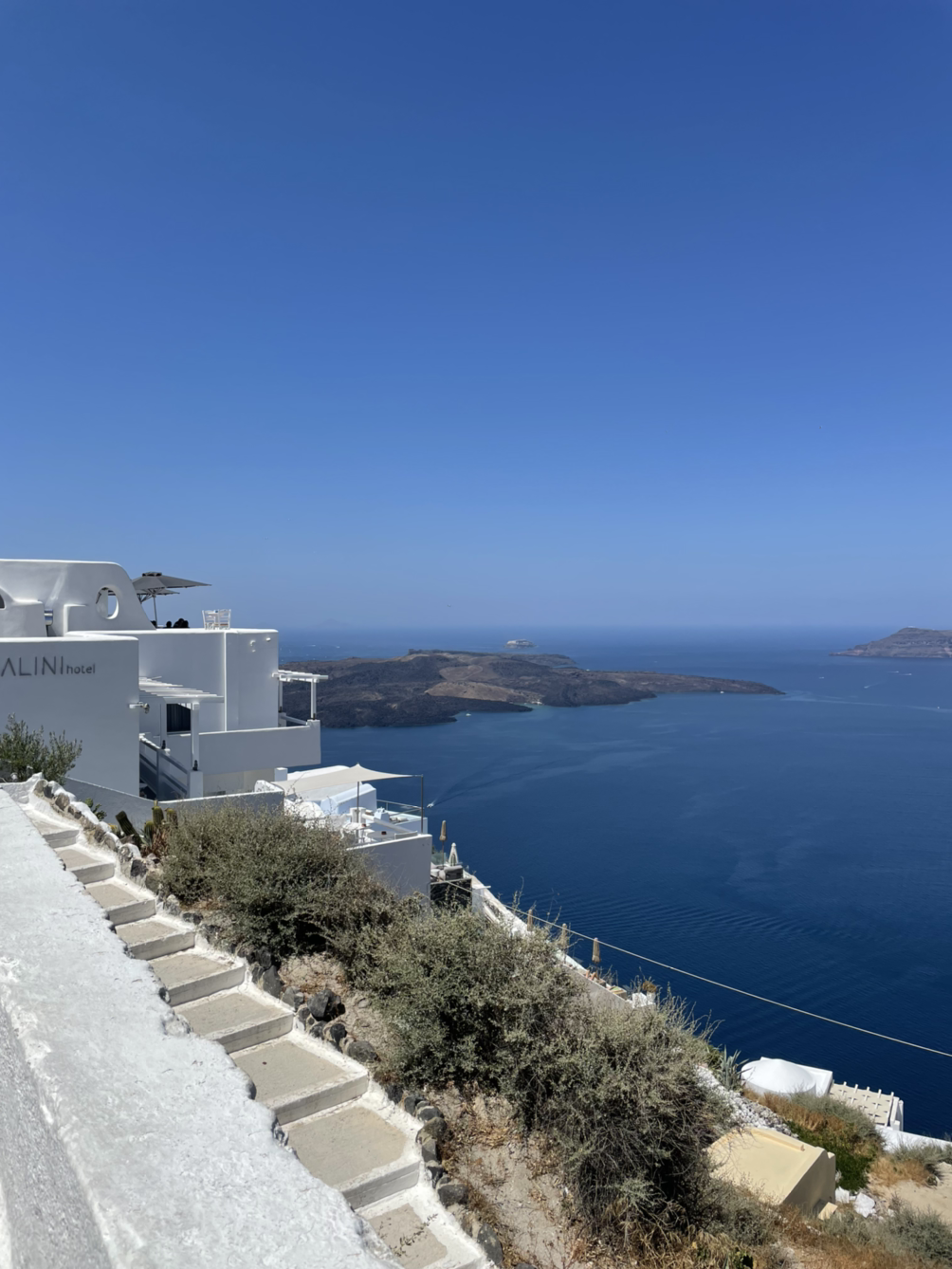 눈이 부셨다. 하늘도 바다도 파랗게 빛났다. 하얀 집들과 파랑, 그리스 국기 색의 조합은 그냥 이 땅에서 나온 거구나. 공항에서 숙소로 10여분 달려와서 택시에서 내렸다. 뒷편으로 걸어가면 된다고 하더니, 건물 뒷편에 바로 해안 길이 나온다. 산토리니 첫인상은 이 사진이다.