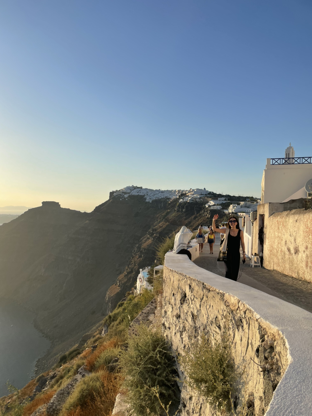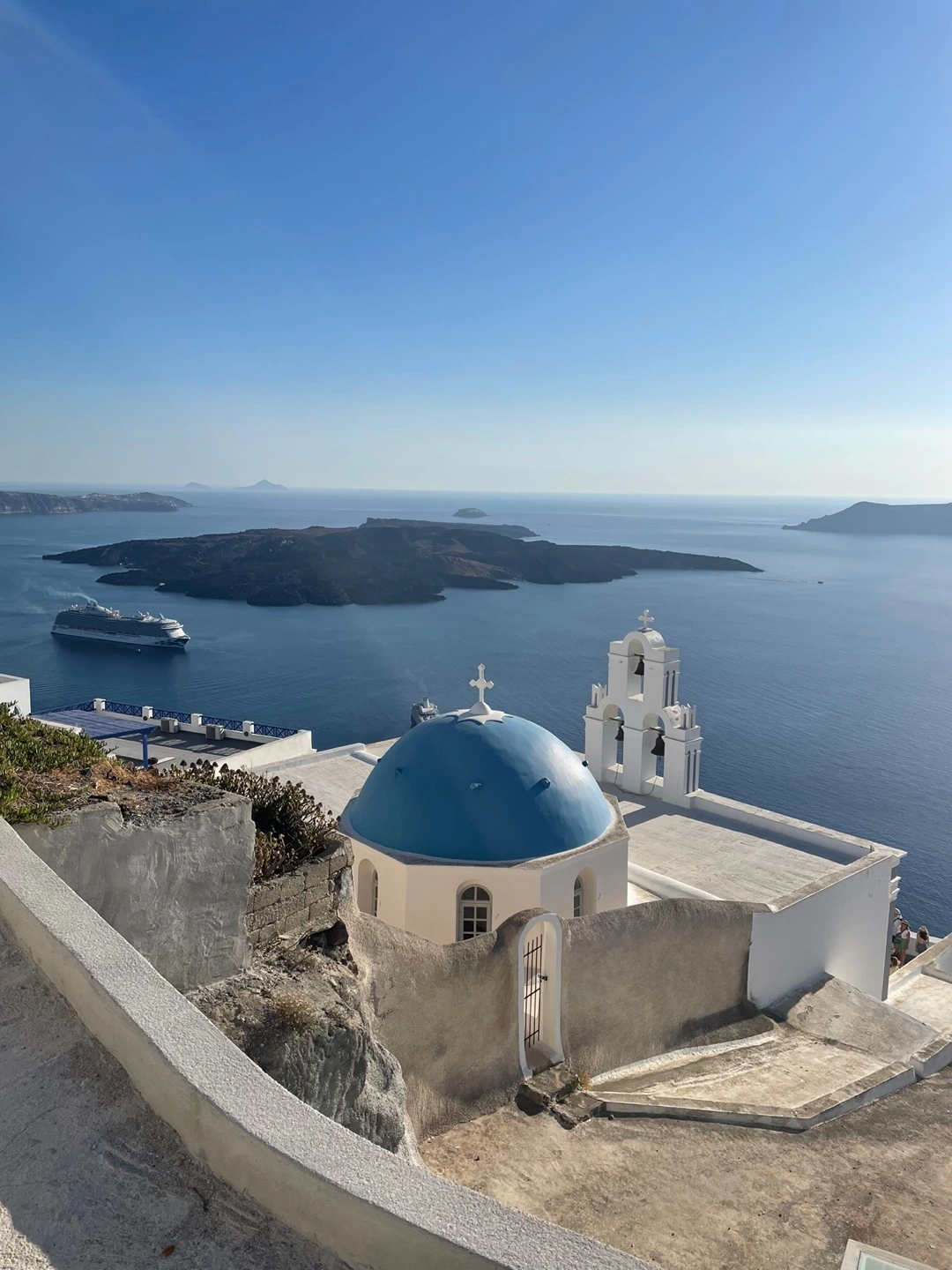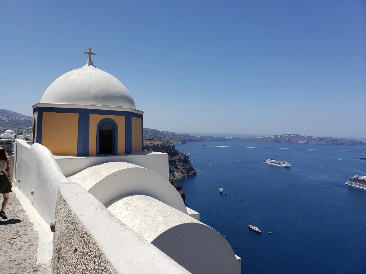 눈이 부셨다. 하늘도 바다도 파랗게 빛났다. 하얀 집들과 파랑, 그리스 국기 색의 조합은 그냥 이 땅에서 나온 거구나. 공항에서 숙소로 10여분 달려와서 택시에서 내렸다. 뒷편으로 걸어가면 된다고 하더니, 건물 뒷편에 바로 해안 길이 나온다. 산토리니 첫인상은 이 사진이다.