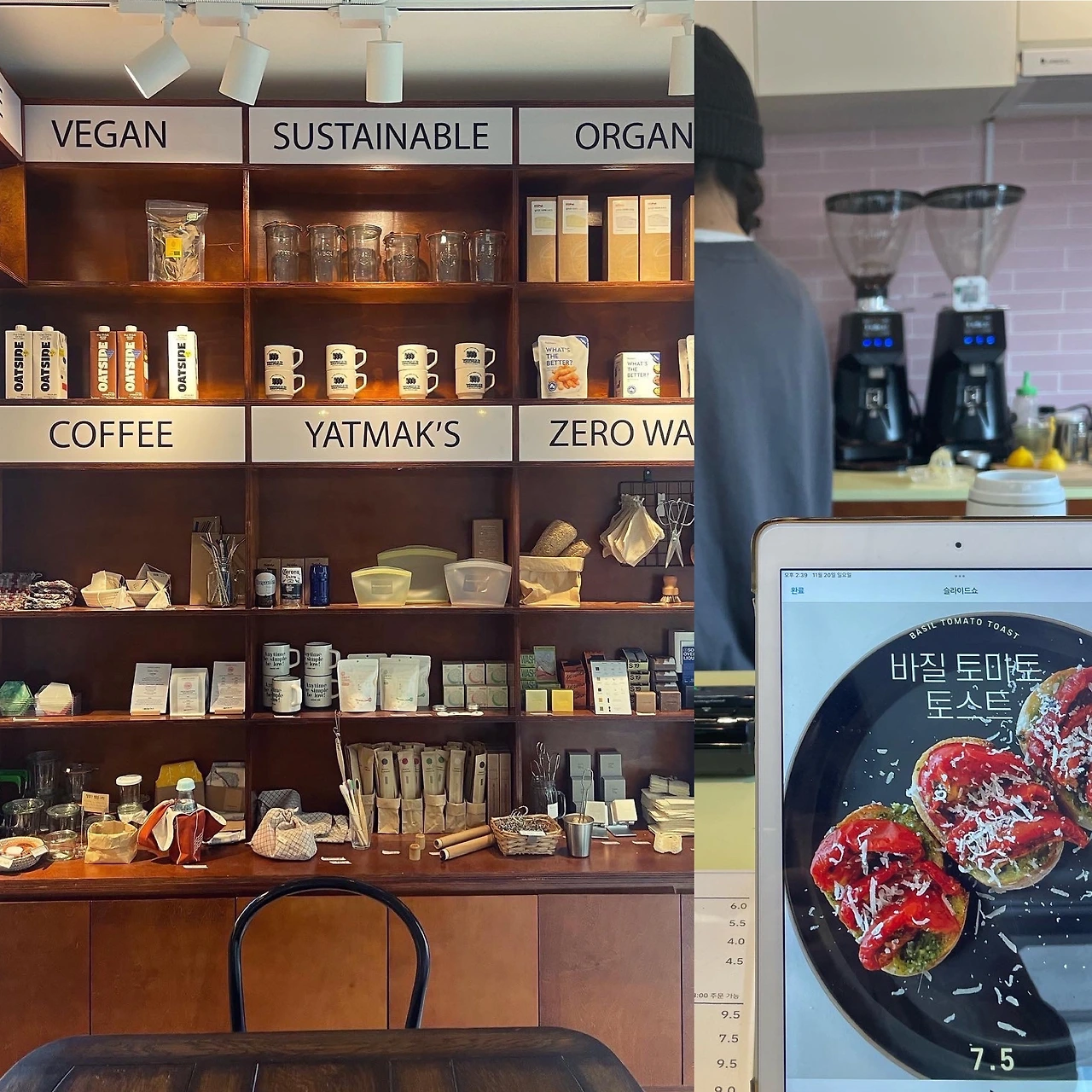 레몬을 바로 짜서 레모네이드 만들어주고 텀블러 테이크아웃은 2천원 깎아주는 #제로웨이스트 카페 #야트막. @yatmak_cafe. 동네 작은 가게들 무조건 응원하는데 이 집 만만찮다. 서대문 기후책모임 포스터 보다가 물어보니 역시나 이 공간에서 열릴 예정이다. 이 작은 가게에서 사장님이 썬드라이드토마토, 루꼴라 꺼내 음식 준비하시는게 예사롭지 않더니만.. 바질토마토토스트는 사진만 보고 침이 돌았다. 양말목을 재활용하거나 병뚜껑 리사이클한 컵받침을 비롯해 환경굿즈들 다양하다.
