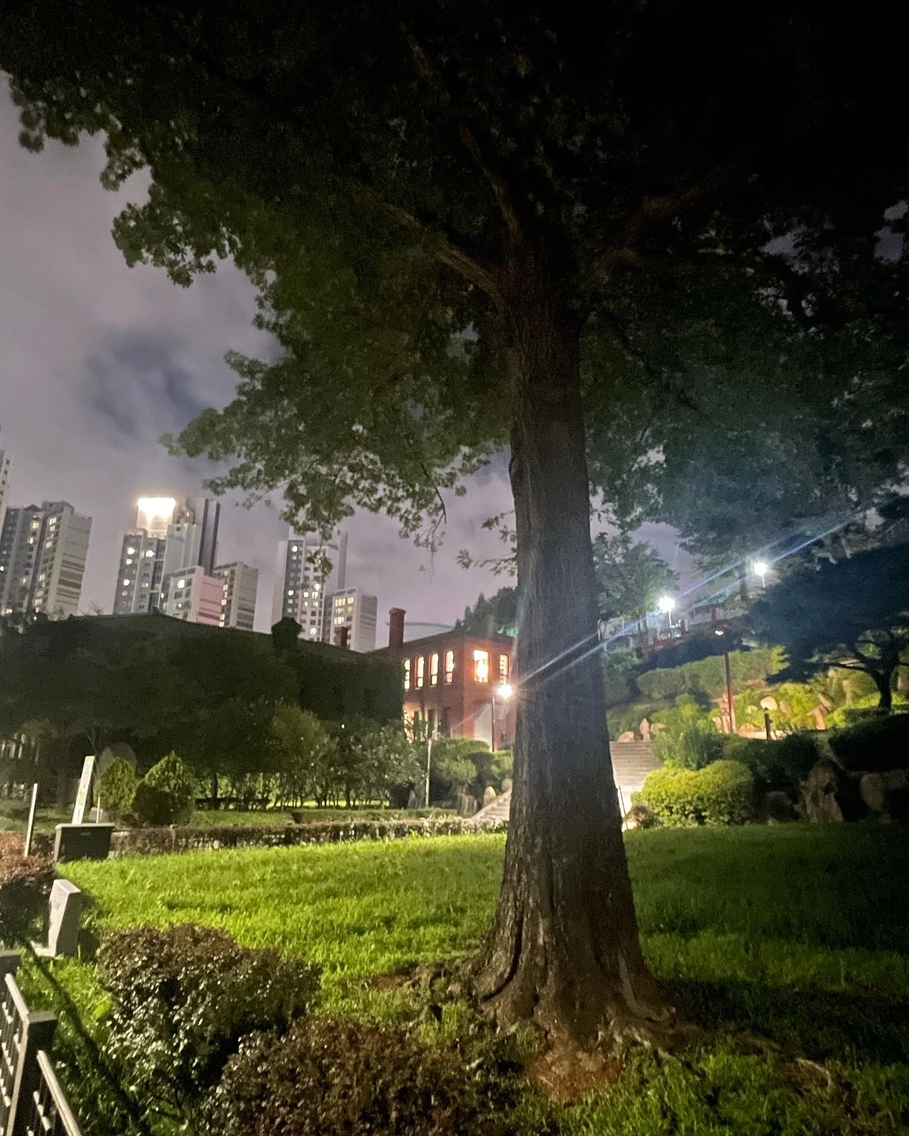 손기정체육공원엔 수영장, 테니스장, 없는게 없다. 오후 9시 넘어 운동장엔 두 트랙에 각각 걷고 뛰는 주민들이 꽤 보였다. 마당의 나무는 1936년 베를린올림픽 마라톤 우승자인 손 선수가 받아온 묘목을 심었다고. 지중해 나무 월계수가 아니라 대왕참나무 가지로 만든 월계관의 그 나무다. 나무를 심은 손 선수 모교인 양정고등학교는 이사갔지만 체육공원이 된 자리에서 수십년 잘 자랐다. 그 시절 사람들에게 벅찬 감동을 남겼던 흔적이라 그런지 어쩐지 설레이는 나무. 이젠 주민들의 의견을 존중하며 지역 공간으로 사랑받는다.