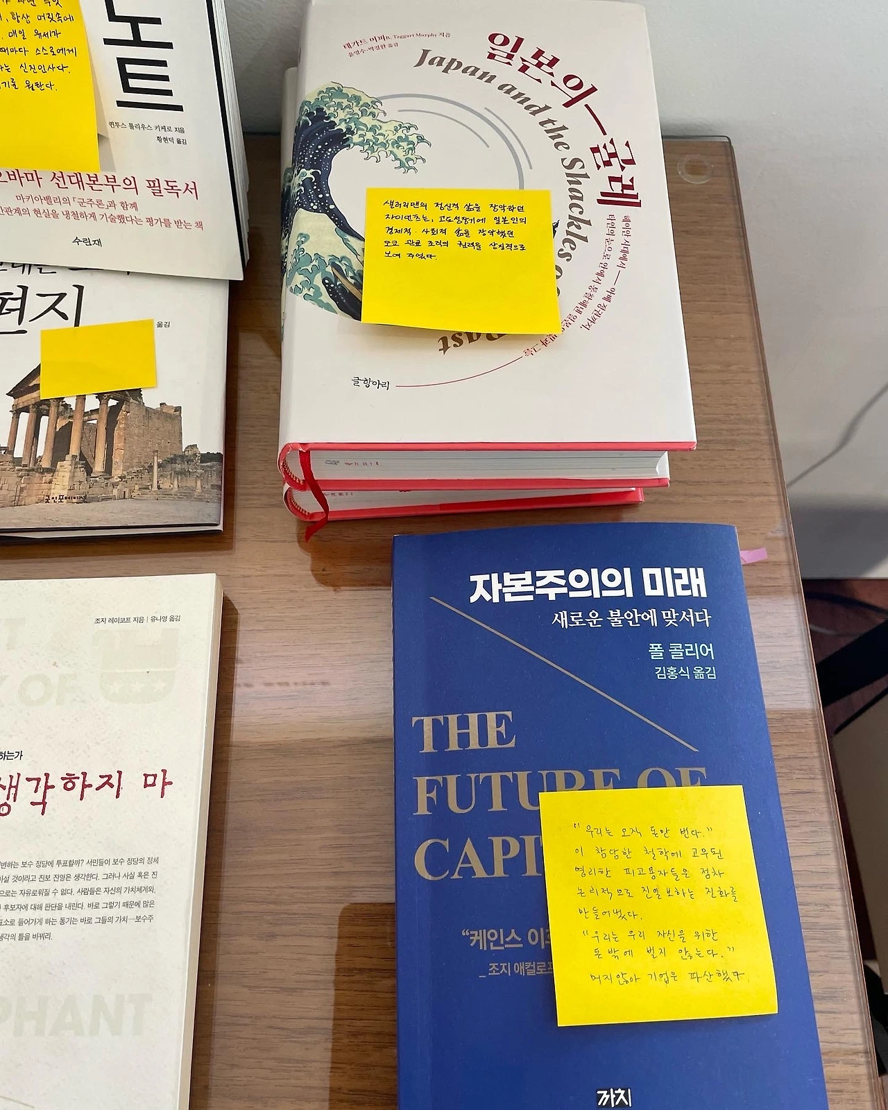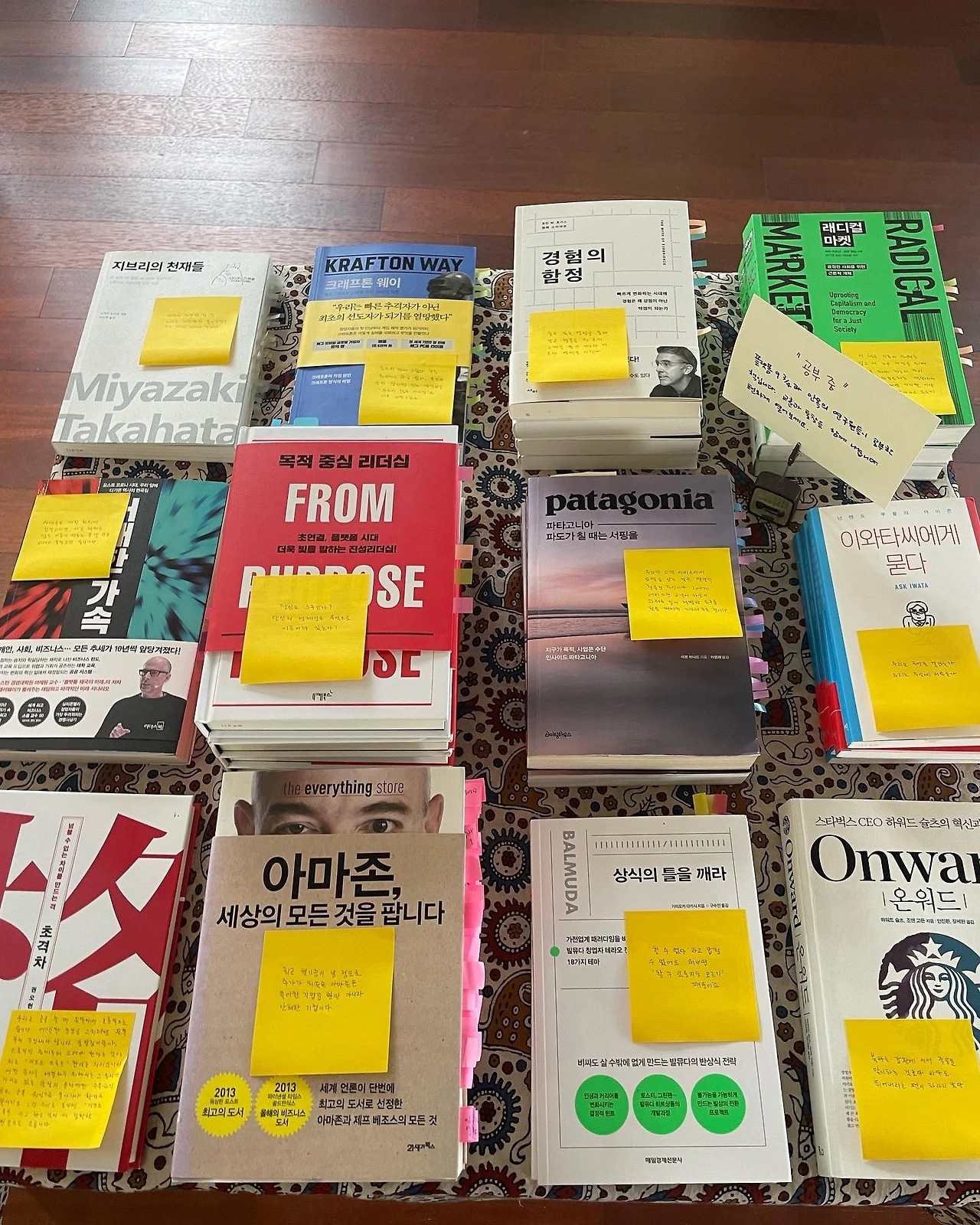 플랫폼9와3/4과 안목 연구원들이 공부한 책들도 ‘공부중’에 모여있다. 홀딱 빠졌던 #래디컬마켓 당당하게 놓여있고 #거대한가속 #크래프톤웨이, 나도 공부한 사람이구나. 작년 최애책 #자본주의의미래 #일본의굴레 반갑다. 깨알 메모들 읽는 재미는 덤이 아니라 선물 같다. 유민영님보다 이인숙 님이 더 고생한걸까ㅎㅎ 분명 즐거웠을게다.