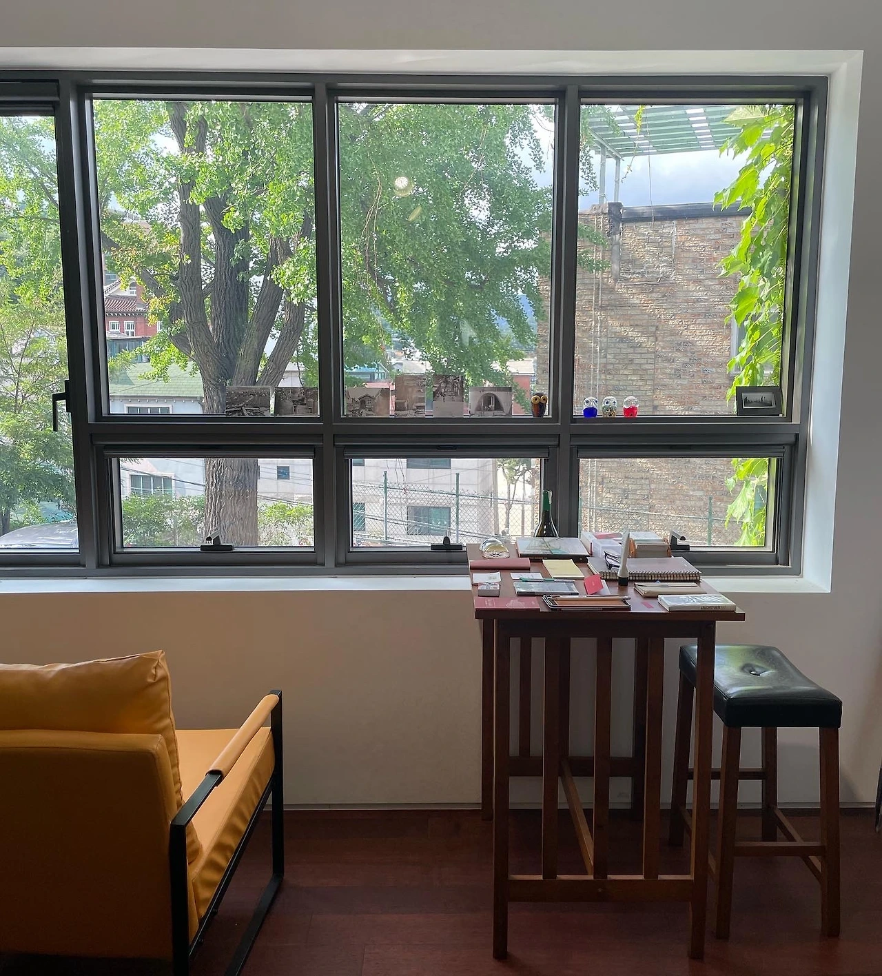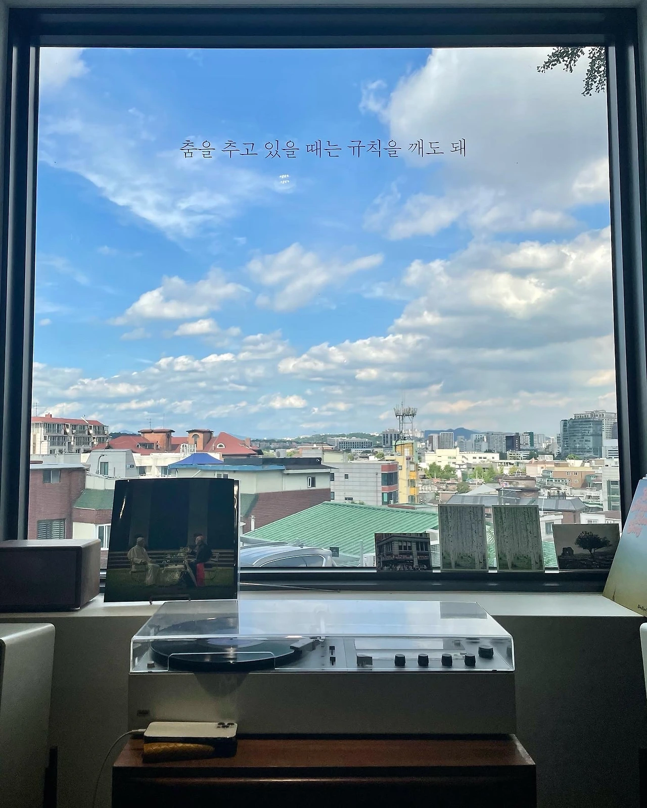 지난 겨울 작은 위로가 됐던 이곳 유리창에 는 글귀가 새로 새겨졌다. ‘춤을 추고 있을 때는 규칙을 깨도 돼’. 꽝인데 늘 욕망하는게 춤. 규칙을 깨려면 춤바람부터 맞아야할까. 낮은 기와지붕 서촌 풍경을 담은 창에 한 끗을 더했구나.