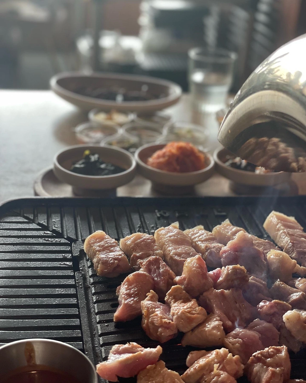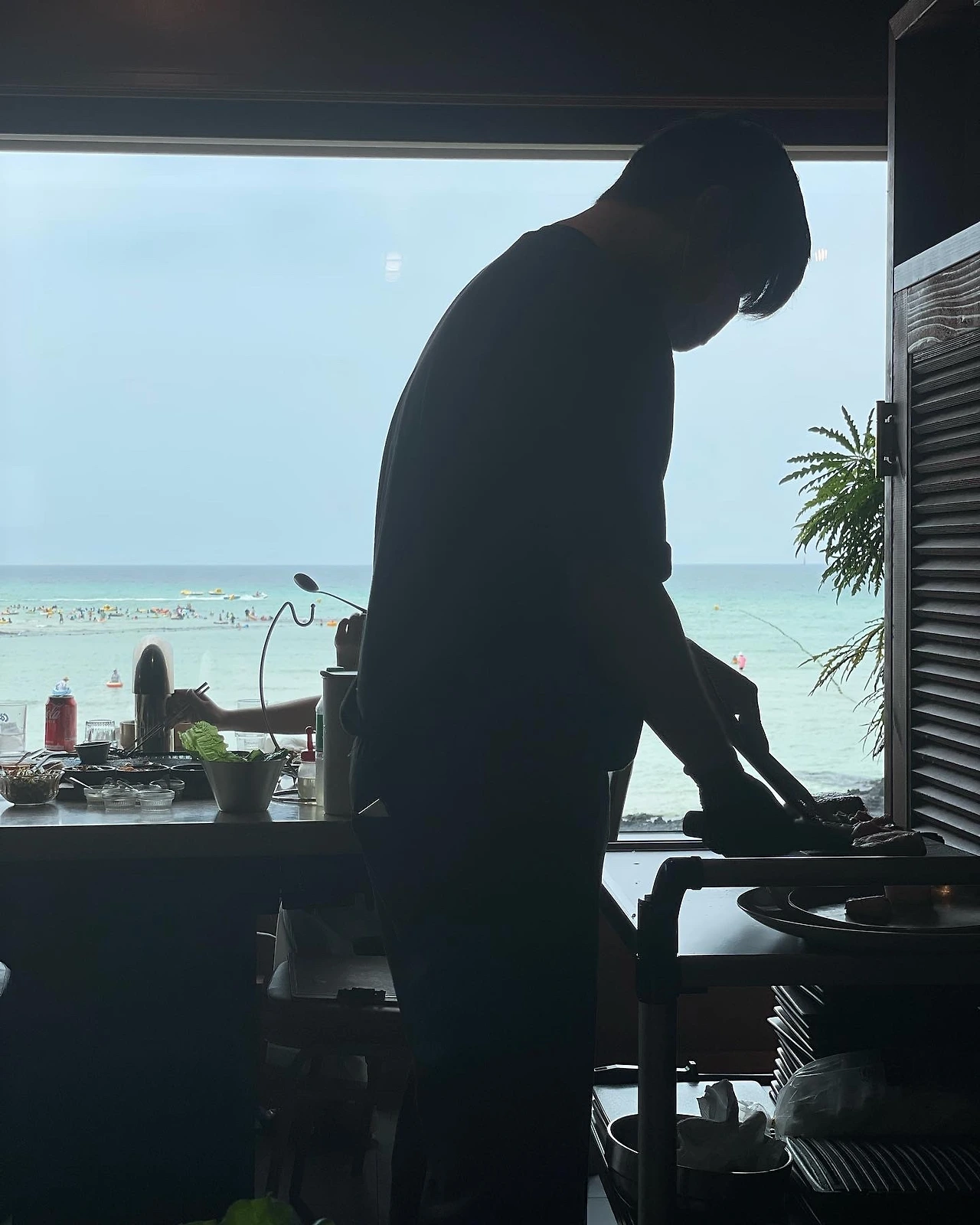점심은 협재 인근 급검색해 뷰와 맛을 다 잡았다는 #협재고기부엌. 통창 너머 바다인데 창가 자리는 놓쳤지만 예약 없이 자리잡았고, 고기와 셋팅 꽤 괜찮다. 흑돼지 모듬에 갈매기살 추가하고 전복구이에 트러플짜파게티로 마무리.