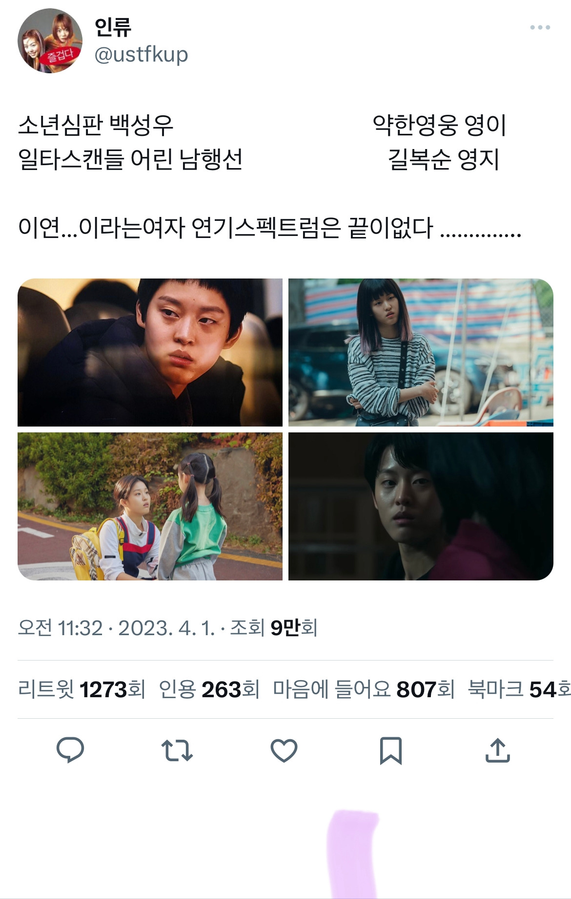 이솜 배우가 “하던 대로 서로 적당히 빙그레 씨발 하자고“ 대사 외엔 소모된 느낌인 반면 이연 배우는 이제야 이름을 기억하게 됐다. ”그래도 선배님이랑 같이 좆된거라 좀 위안이 되네요“.. 그 선배님 아역으로 일타스캔들에도 나왔고, 약한 영웅, 소년심판의 그를 이제야 기억한다. 95년생. 두근거리는 기대감