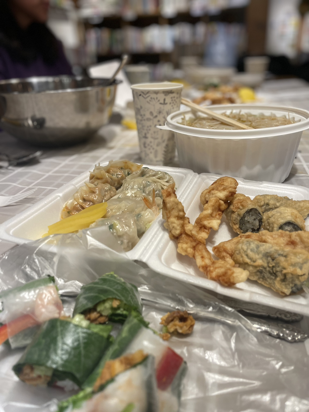 여러가지 질문을 해주신 그날 독자이자 청자에게 감사했다. 행사가 끝나자 서점의 공부 테이블에는 식탁보가 깔렸고, 참석자들이 만두, 쌀국수, 떡볶이, 튀김 등 동네 맛집에서 한꾸러미씩 음식을 사들고 오셨다. 동네 사랑방의 풍경은 언제봐도 즐겁다.