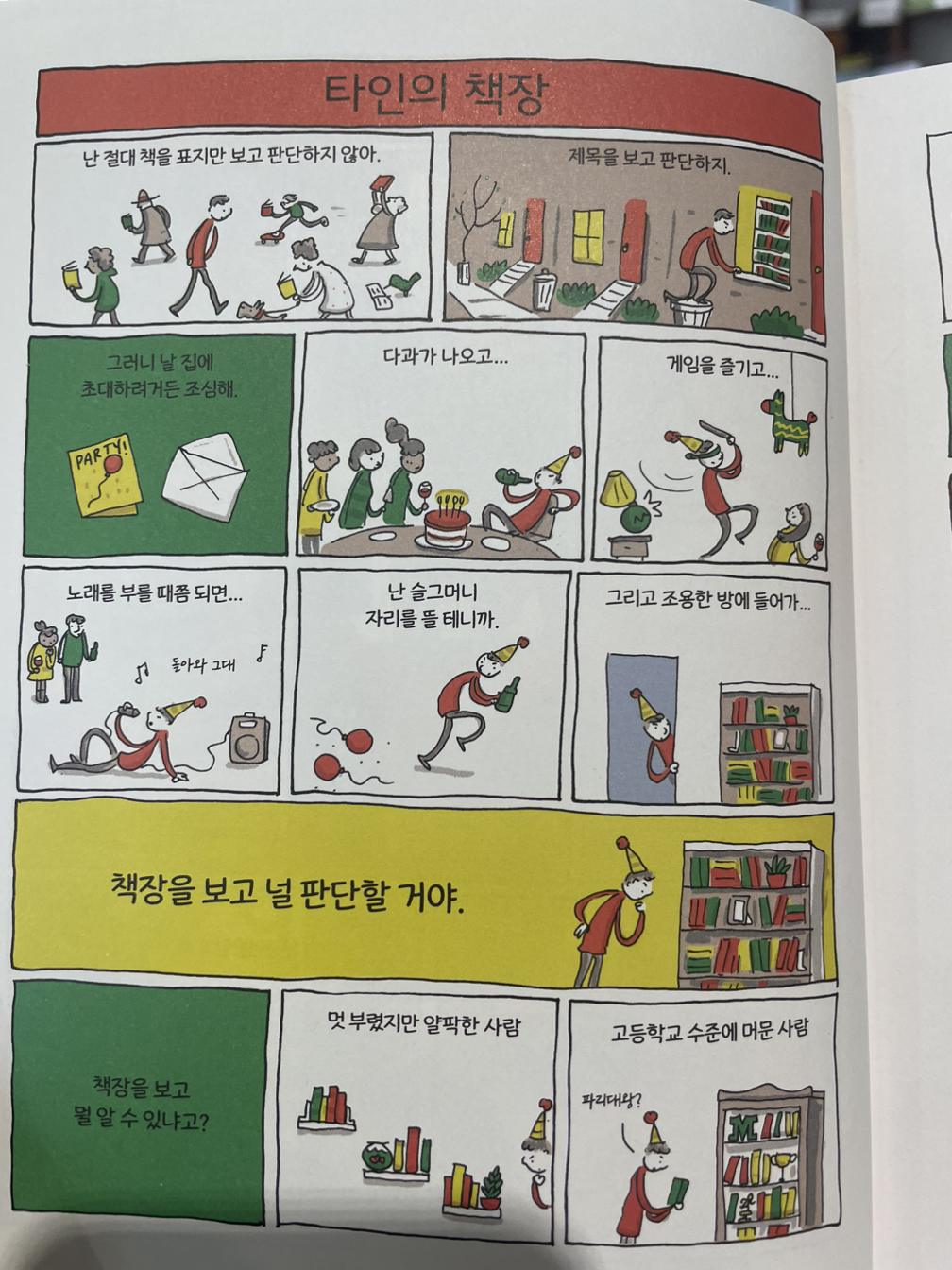"하지만 요즘 사람이 책 읽을 시간이 어디 있어. 집에 갖다 놓은 책 대부분은 결국 펴보지도 않겠지. 혹시 이런 사람이 되면 모를까...