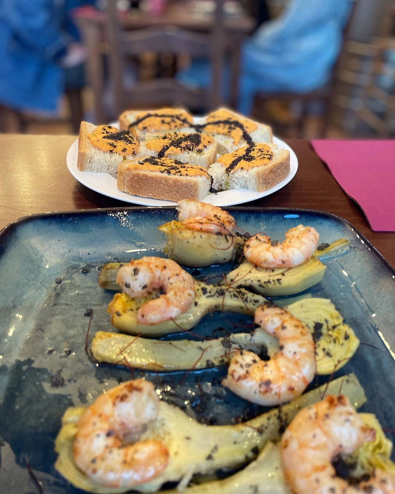 아티초크는 고대 로마인들도 별미로 먹었다는데, 구운 새우를 얹었다. 트러플 소금과 오일을 듬뿍 쓴 거 같은데 구글 평점 4.9 리뷰가 온틍 이 메뉴였다. 나는 곁들여 나온 빵에 반했다. 차가운 토마토 소스와 올리브유에 흠뻑 적신 빵에 정신을 차리지 못했다.