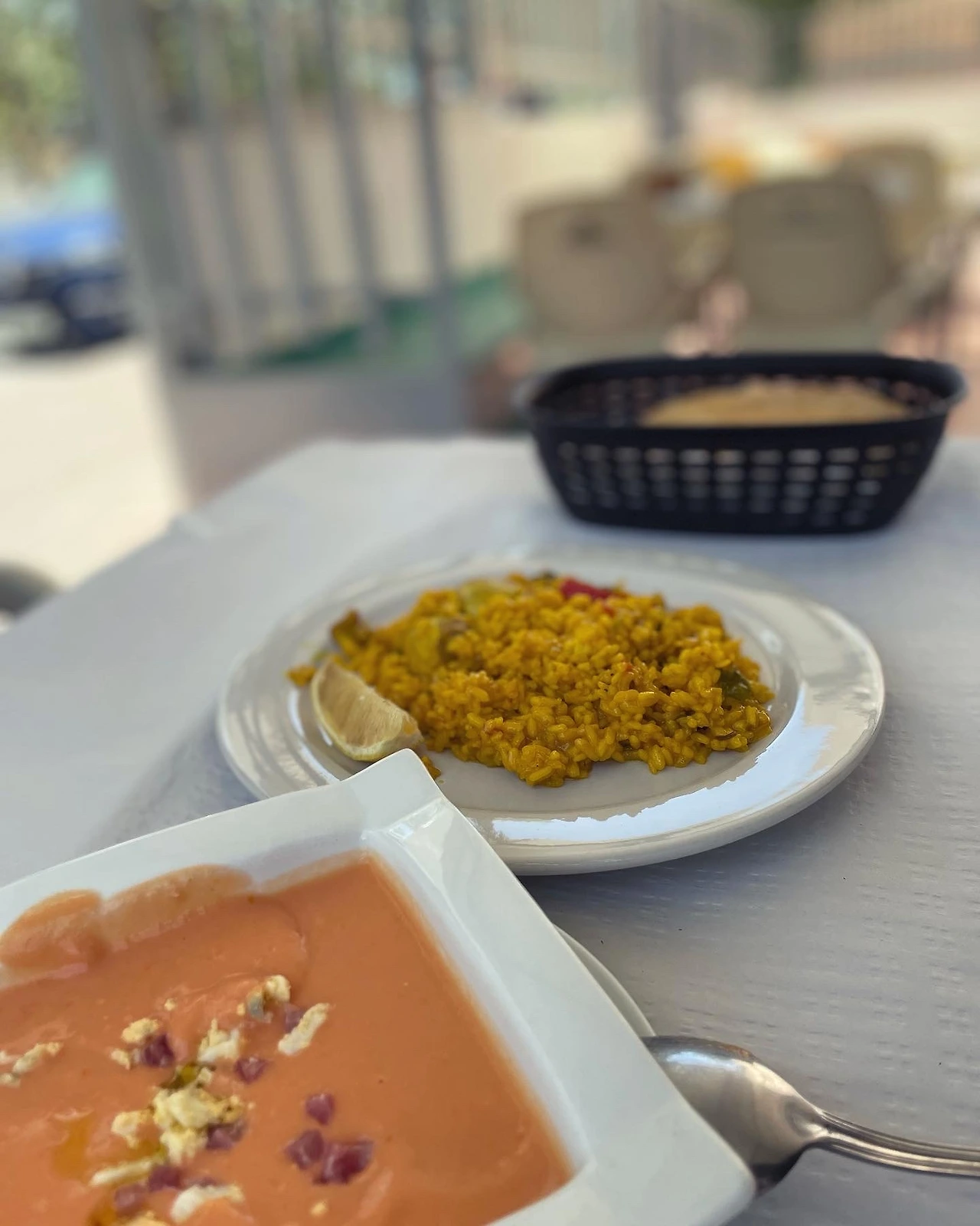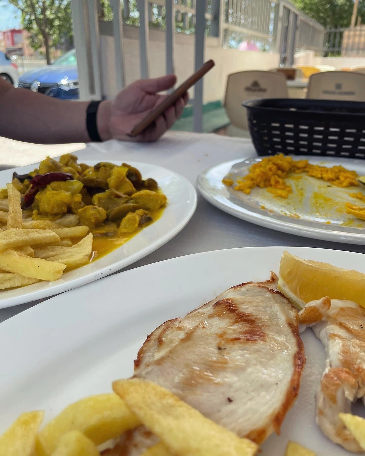 점심은 그라나다에서 고속도로, 아니 국도 타고 가다가 검색한 길가 맛집. 메뉴판이 없다. 수첩에 메모해서 설명해주는 집이다. 스타터 메뉴로 빠에야? 좀 이상했지만 주문했다. 스타터로 나온 차가운 토마토 스프, 홀딱 반해서 퍼먹었다. 근데 옆에 빠에야를 보니 이게 스타터라고? 메인으로 소스 얹은 돼지고기와 구운 닭고기. 돼지는 카레 같아서 편했고, 닭은 레몬즙과 소금으로만. 다행히 양이 많지 않아 네 접시를 둘이 해치웠다. 가격도 20유로 밖에 안했네.