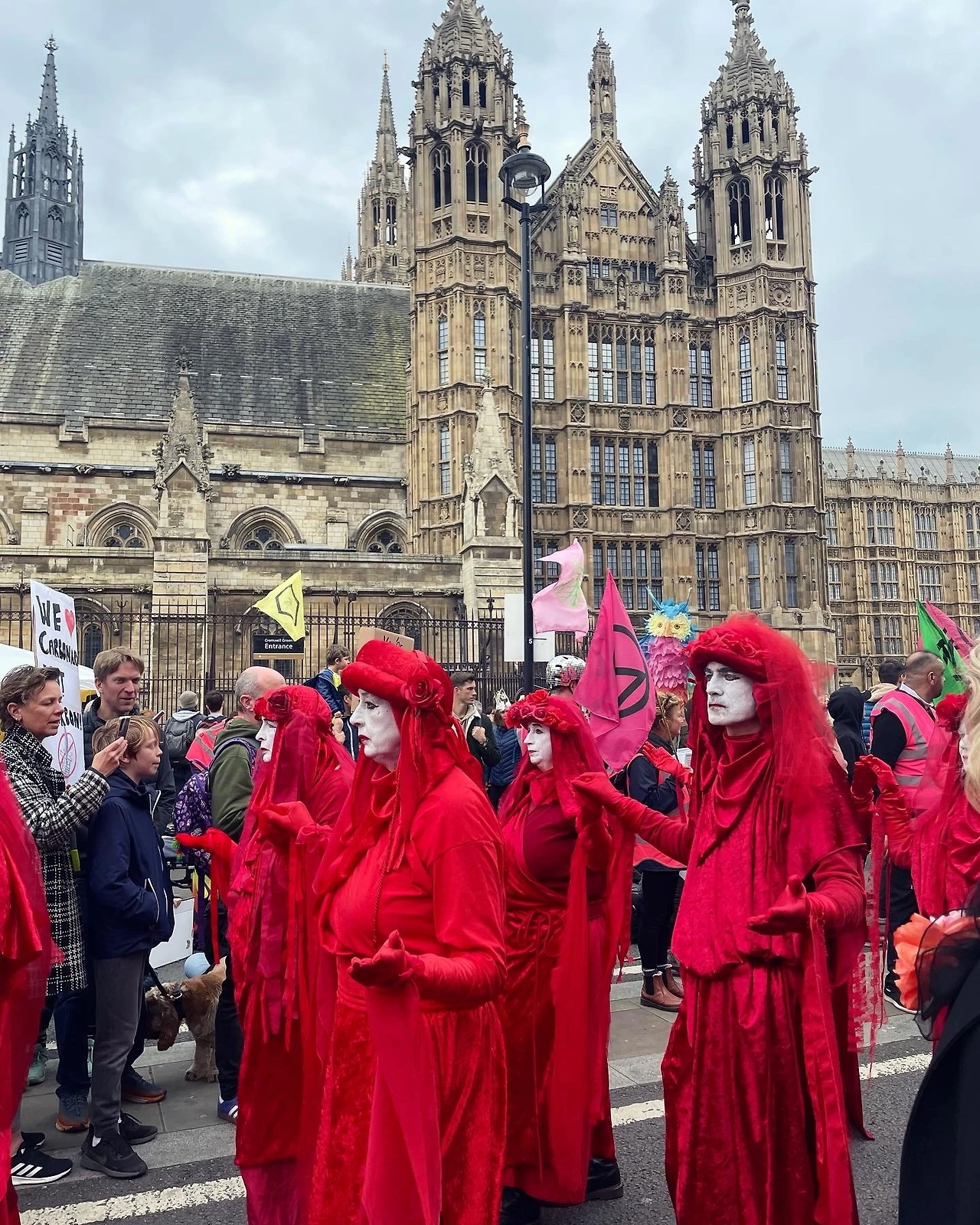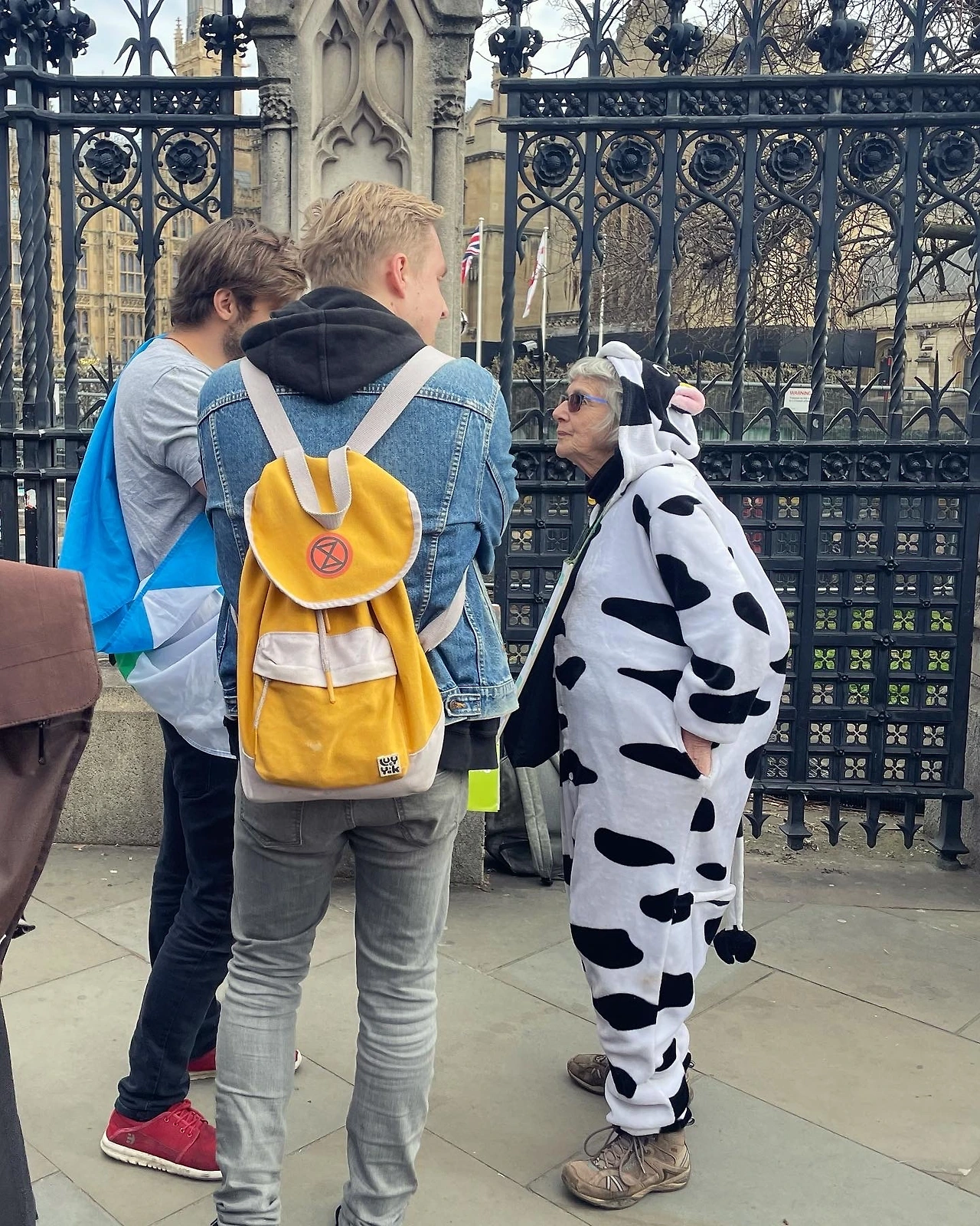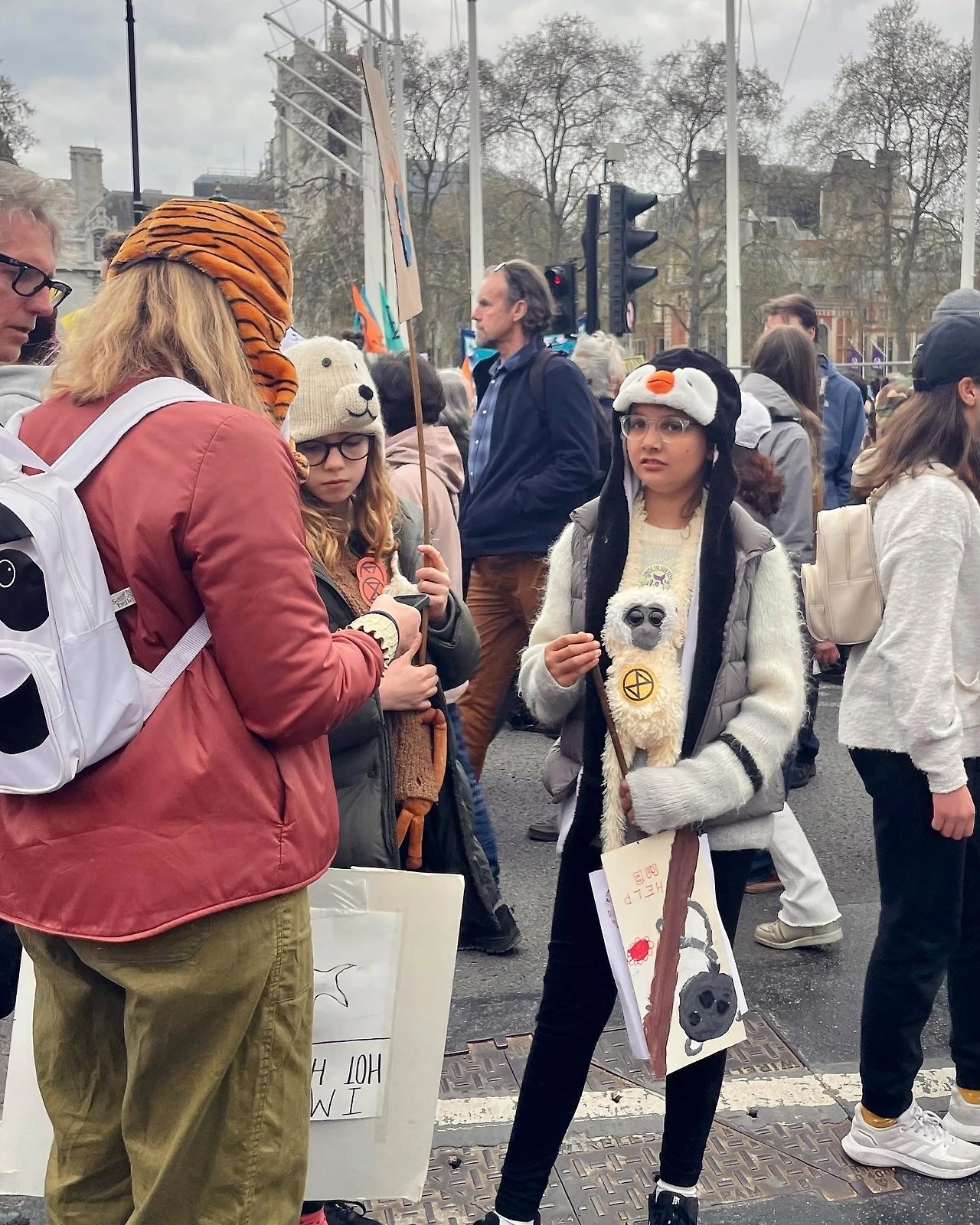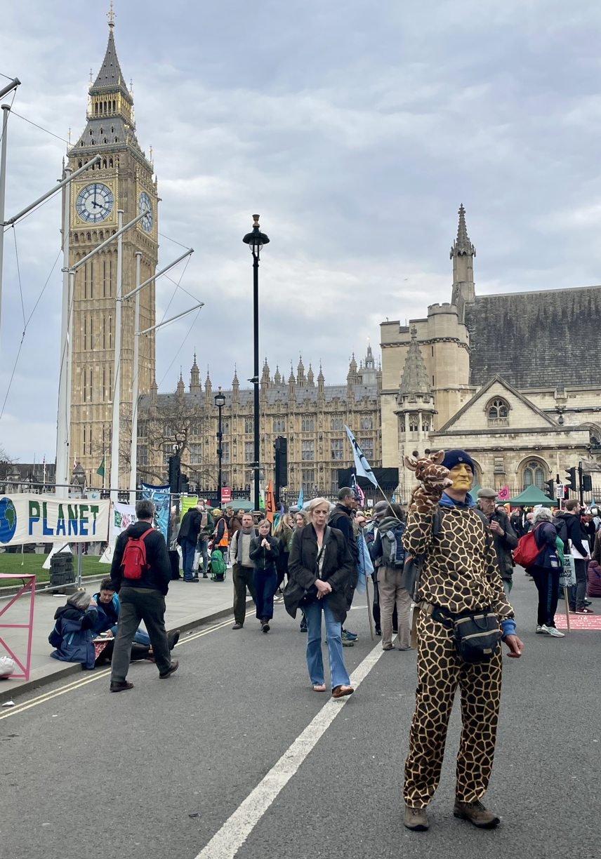 빨간 분장 시위대, 셸 반대 깃발 뒤의 펭귄 옷 남녀, 빅벤 사진은 이걸로 퉁치는, 기린 옷 아저씨, 암소 옷 아주머니, 동물모자 어린 친구들, 차를 마시며 대화 나누는 언니들… 시위가 재미있어 보인다. 민주주의 선진국인 우리도 그 재미 알았는데.