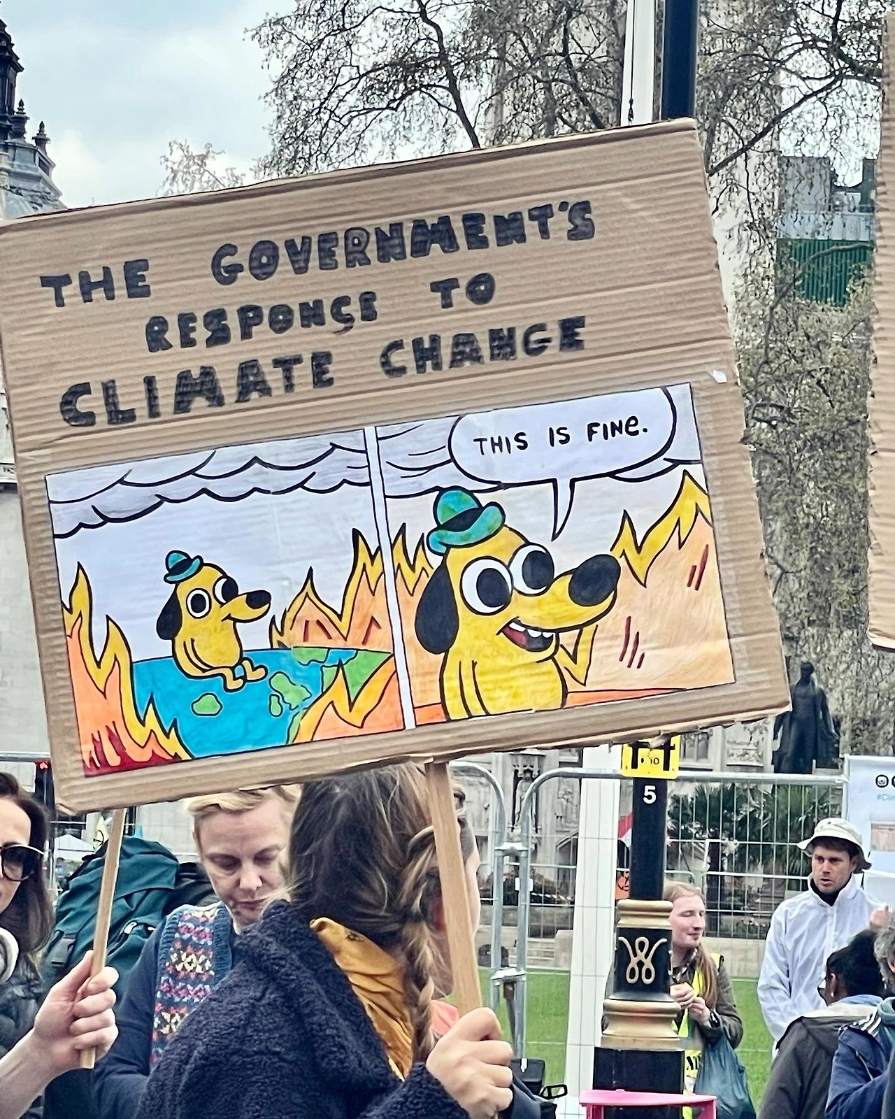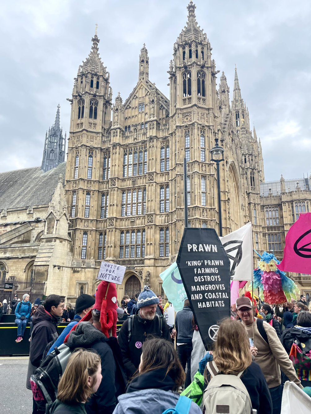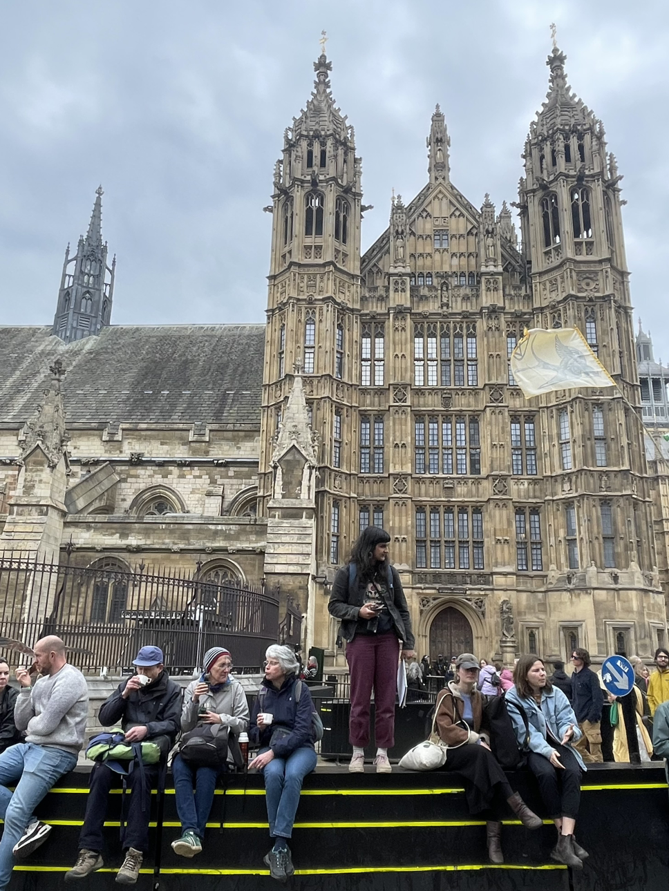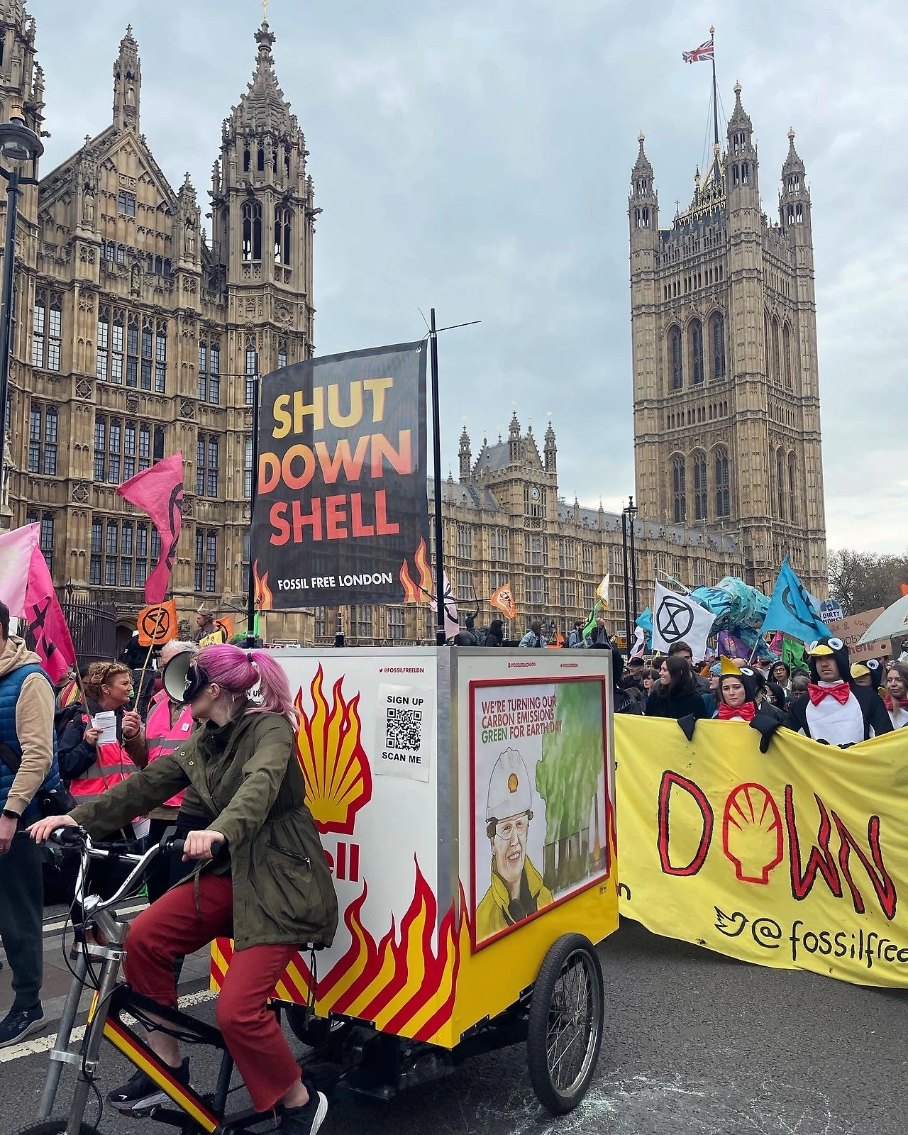 빨간 분장 시위대, 셸 반대 깃발 뒤의 펭귄 옷 남녀, 빅벤 사진은 이걸로 퉁치는, 기린 옷 아저씨, 암소 옷 아주머니, 동물모자 어린 친구들, 차를 마시며 대화 나누는 언니들… 시위가 재미있어 보인다. 민주주의 선진국인 우리도 그 재미 알았는데.