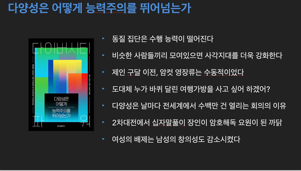 책의 부제는 '다양성은 어떻게 능력주의를 뛰어넘는가'. 다양성이 올바르기 때문이 아니라, 다양성이 능력주의 보다 결과가 낫기 때문에 중요하다고 역설한다. 다양성과 탁월한 능력 중 하나만 선택할 수 있다던 미국 스칼리아 대법관은 틀렸다. 능력 위주로 구성했으니, 정부 고위직에 다양성 없는 건 문제없다던 윤석열 대통령도 틀렸다.