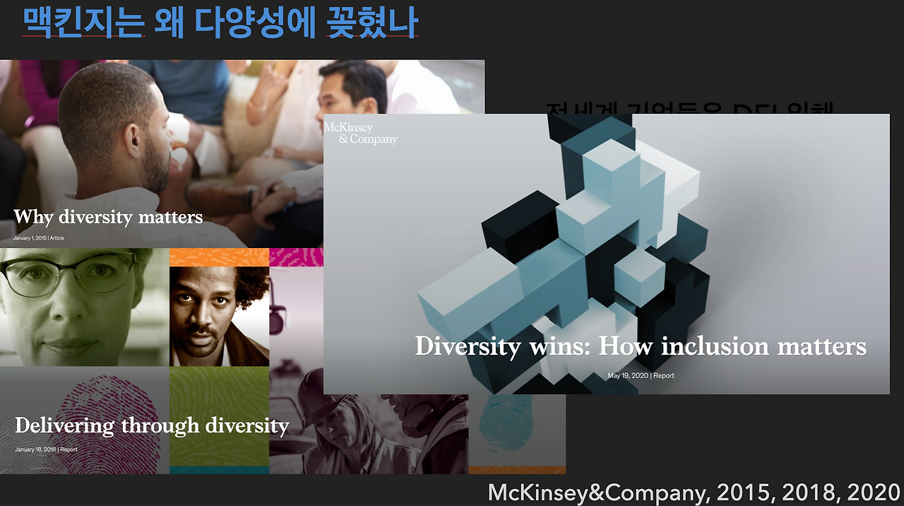 맥킨지는 몇년 째 계속 다양성 얘기다. 2015년 보고서로 세바시 강연 준비했는데, 그새 더 나왔다. 경영진의 젠더 및 인종 다양성 상위 기업의 자기자본수익률은 하위 그룹보다 66% 높다고 한다.