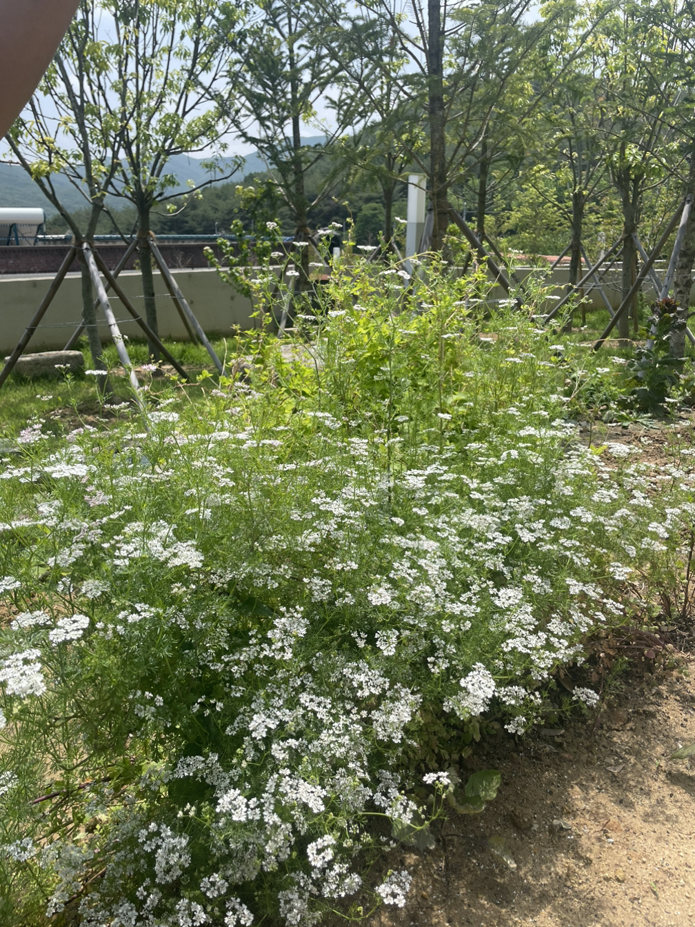 당근 연녹색 순이 꽃보다 예쁘고, 하얀 고수 꽃도 아름답다.