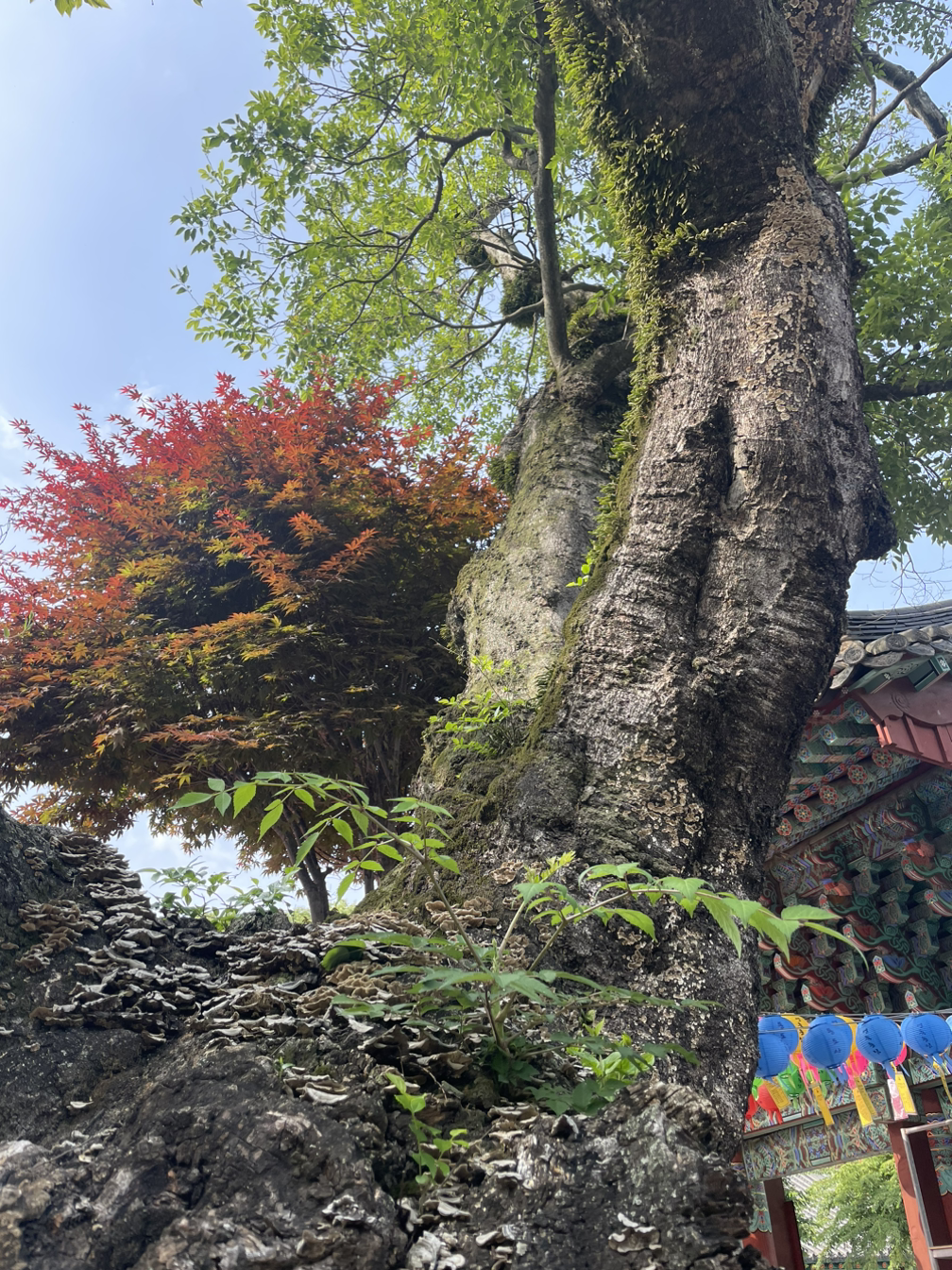 통도사에서 팽나무 가지에 뿌리 내린 두릅나무를 만났다. 그 아랫쪽엔 버섯도 자라고, 윗쪽 가지에는 이끼를 닮은 난초 같은 아이도 빽빽하게 자라고 있었다. 여럿에게 생명을 나눠주는 나이 든 나무. 아마 모르고 지나갔으면 보지 못했을게다. 숲해설사 K님 설명을 듣고 보니, 경이로움에 저릿했다. 이래서 사람이 공부를 하나보다. 알고 보면 세상은 온통 신비롭다.