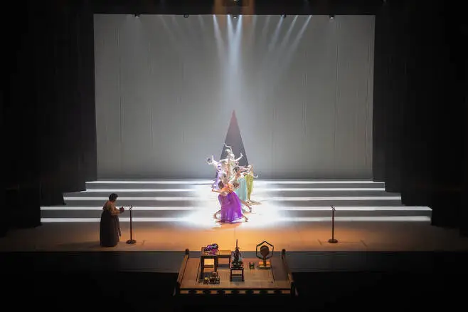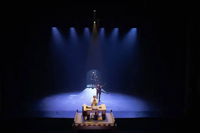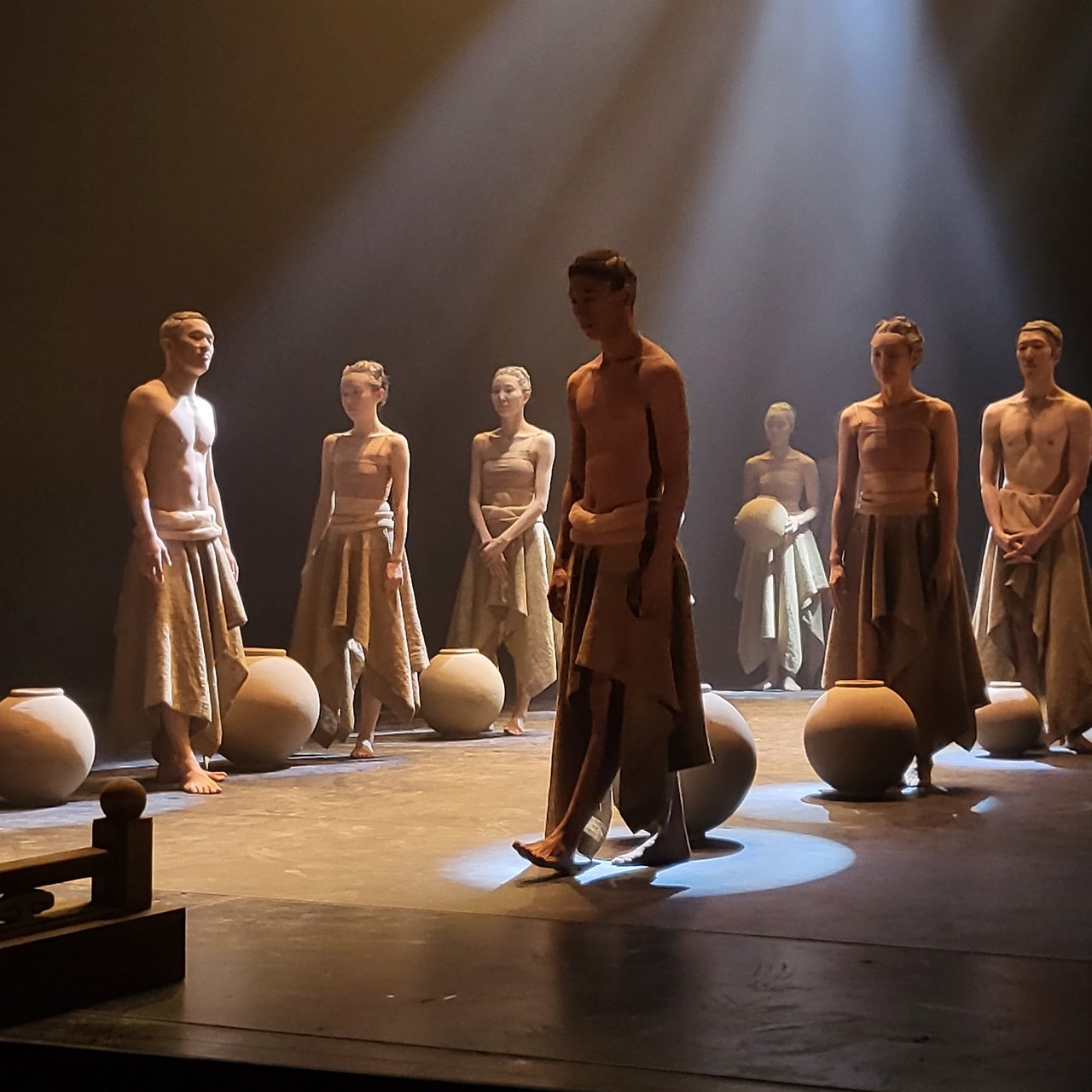 무대 가장 앞에서 발물레를 돌리며 손수 그릇을 빚는 장인, 끈틀을 돌리는 일을 연주처럼 해내는 장인, 그 뒤로 춤사위가 아름다웠다. 몸의 선에 먼저 반했고, 공간을 지배하는 몸짓에 감탄했다. 누에고치 의상을 비롯해 매번 바뀌는 의상, 격조를 보여주는 무대장치에도 설레였다.