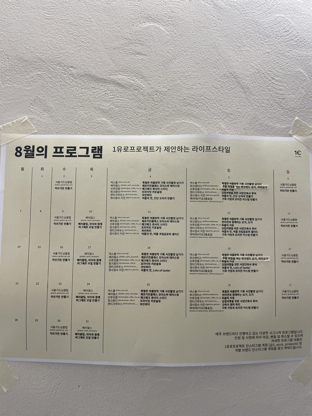 70개 브랜드가 신청해 17개 입점했다. 입주 조건은 사람들이 모이고 엮이는 프로젝트를 일주일에 하나씩. 여름방학 사진남기기, 여름의 맛, 오이지나 과일음료 만들기, 건축사 투어, 가죽 공에 등 별별걸 다한다.