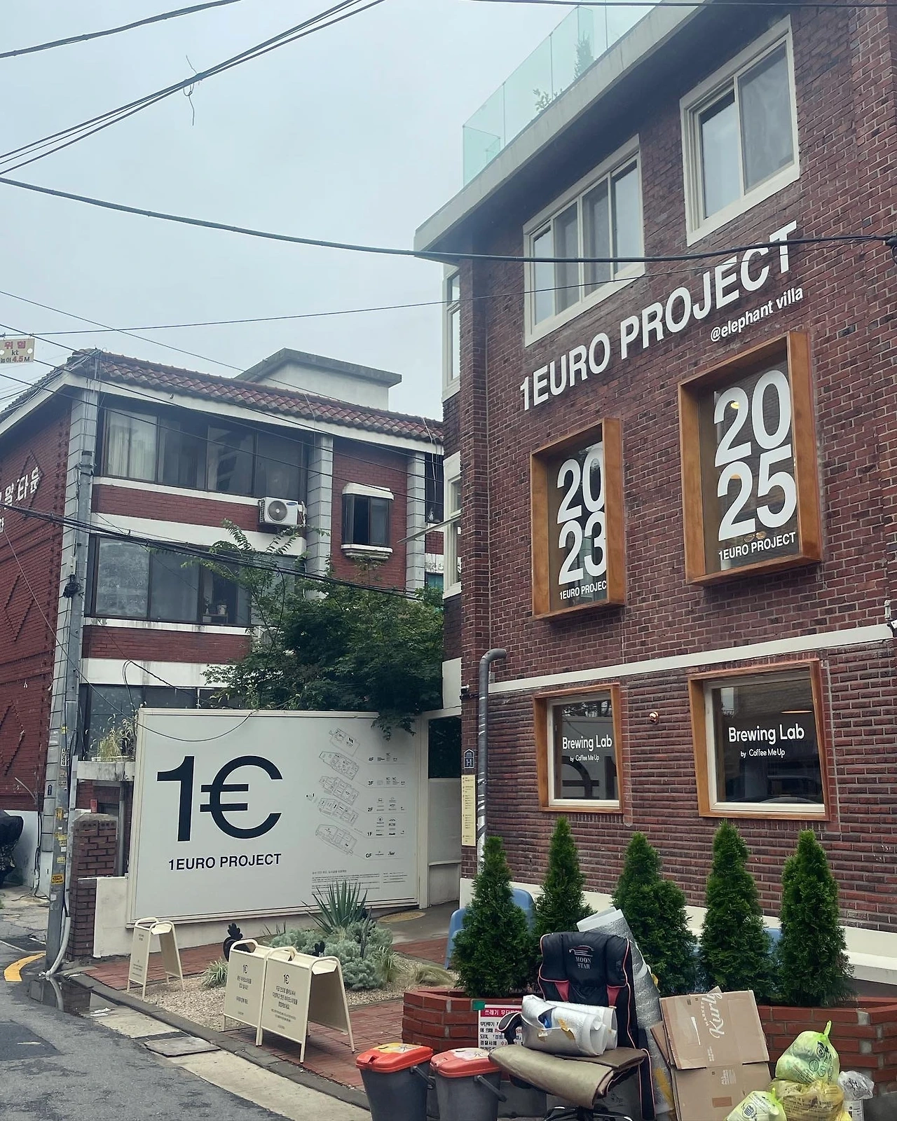 오래된 빈집을 바꾸는 공간 마법. 비용은 3년 임대료 1유로다. 착한 건물주로부터 1유로에 빌린 비싼 도심 속 낡은 공간을 좋은 라이프스타일 브랜드들에게 무상으로 빌려주는 #1유로프로젝트. 성수역에서 마을버스로 10분 거리 코끼리빌라 한 동이 변신했다.