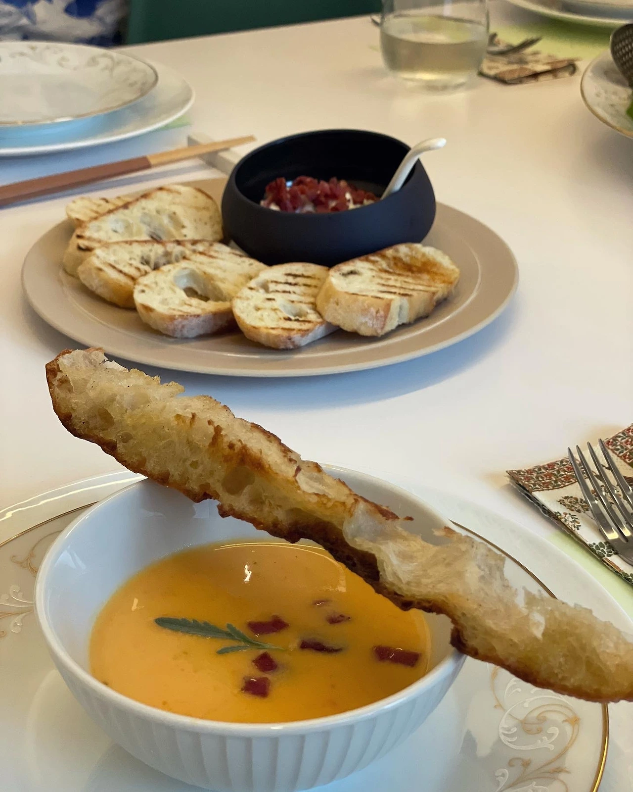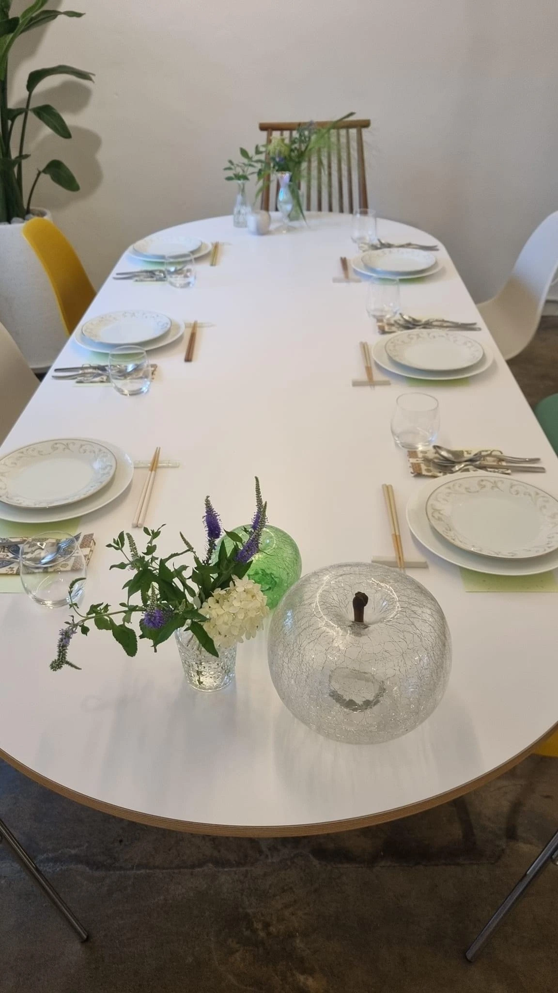 와중에 #겸사겸사키친, @geomsa_geomsa 쿠킹 클래스도 하고 원테이블 다이닝도 겸사겸사. #느긋하게_밥안주 저자이자 멋쟁이 셰프님 Joo Young Choi 쌤 공간이다. 테이블의 작은 꽃 하나, 커트러리, 모든게 세심하고 예쁘다.