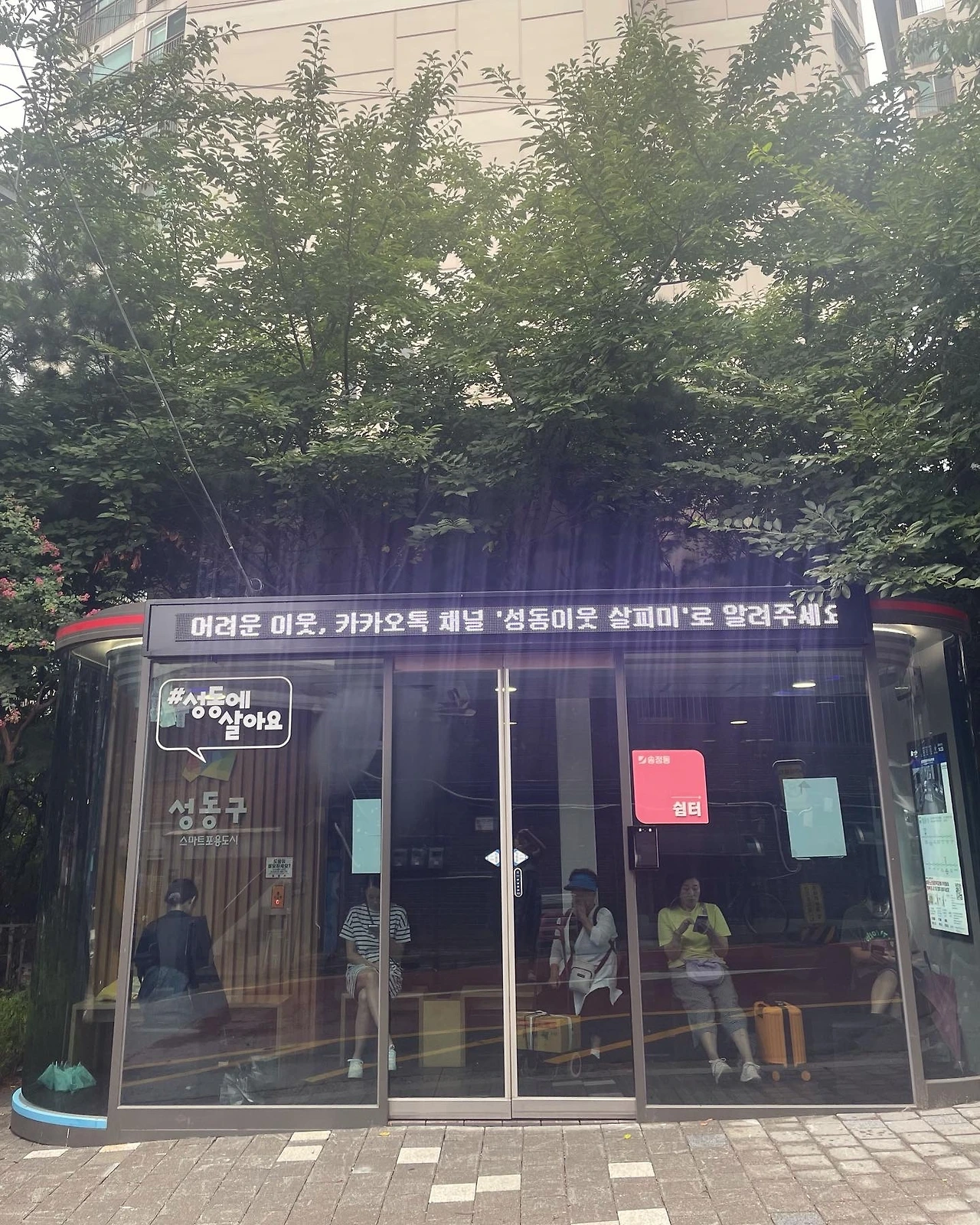 성동구 마을버스 정류장 부스는 에어컨 시원하고 와이파이에 충전까지 완벽한 쉼터. 버스 알림 시스템도 본 중 최고다. 이래서 성동 성동 하는구만. #성동에살아요 태그도 좋고, 취객 문제나 물건 분실까지 비상벨도 센스 있다.