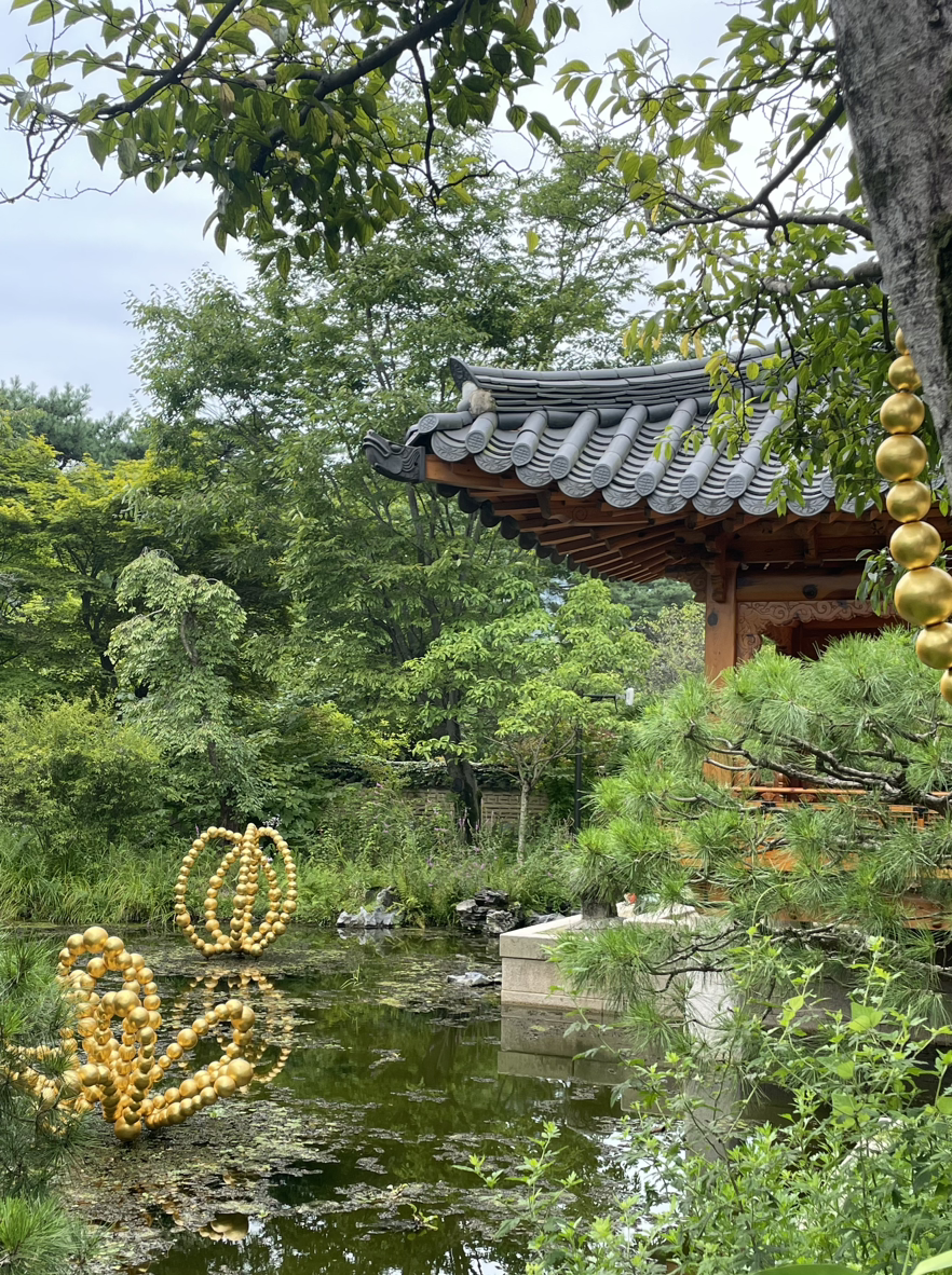 장-미셸 오토니에의 황금연꽃과 황금목걸이 같은 직품이 난데 없이 정자 앞 연못에 있는 마당에!