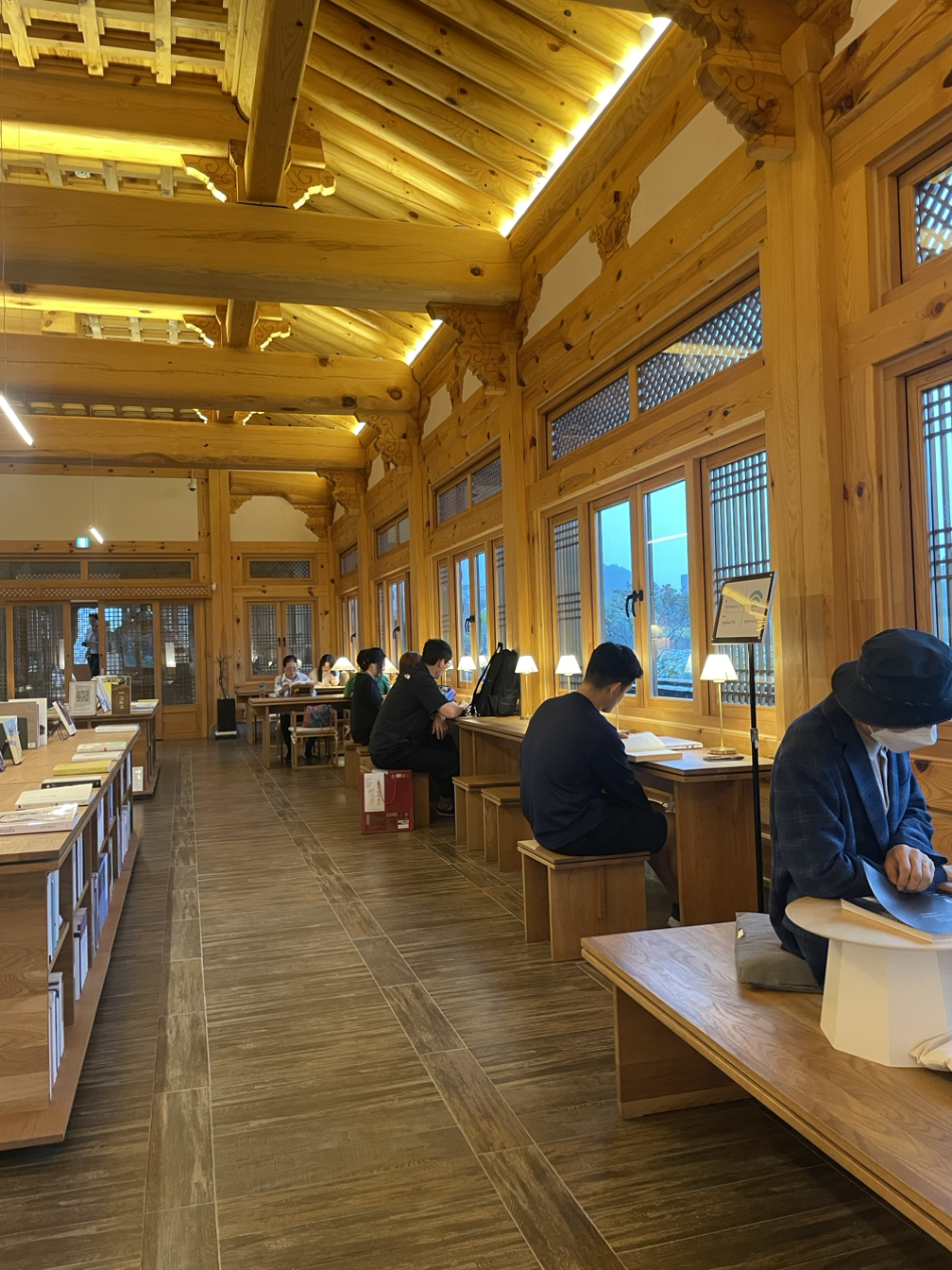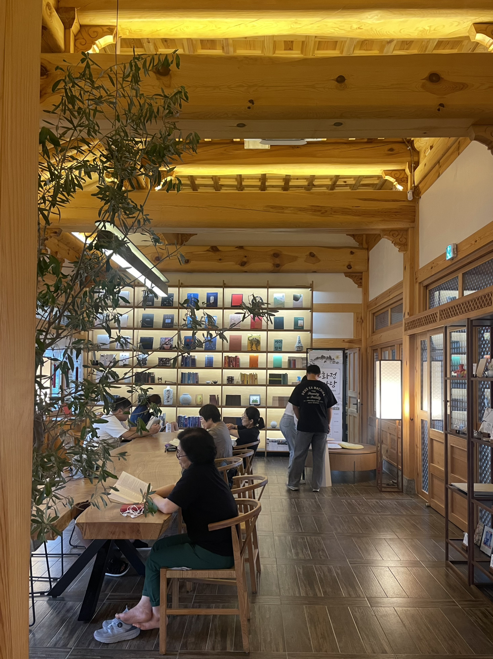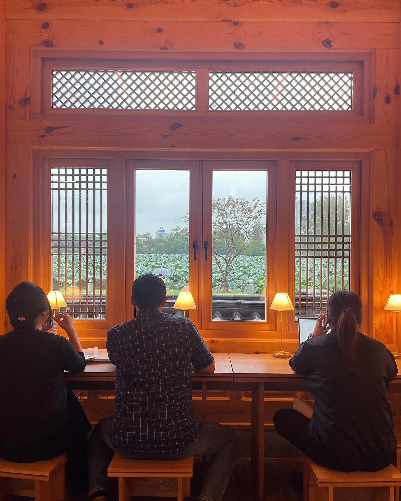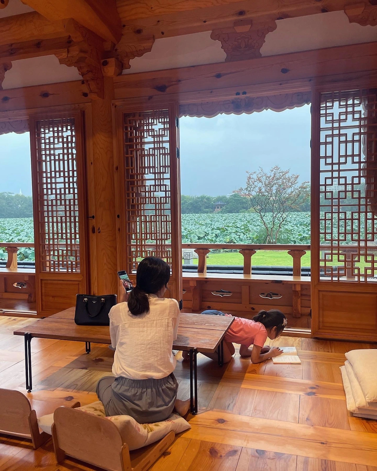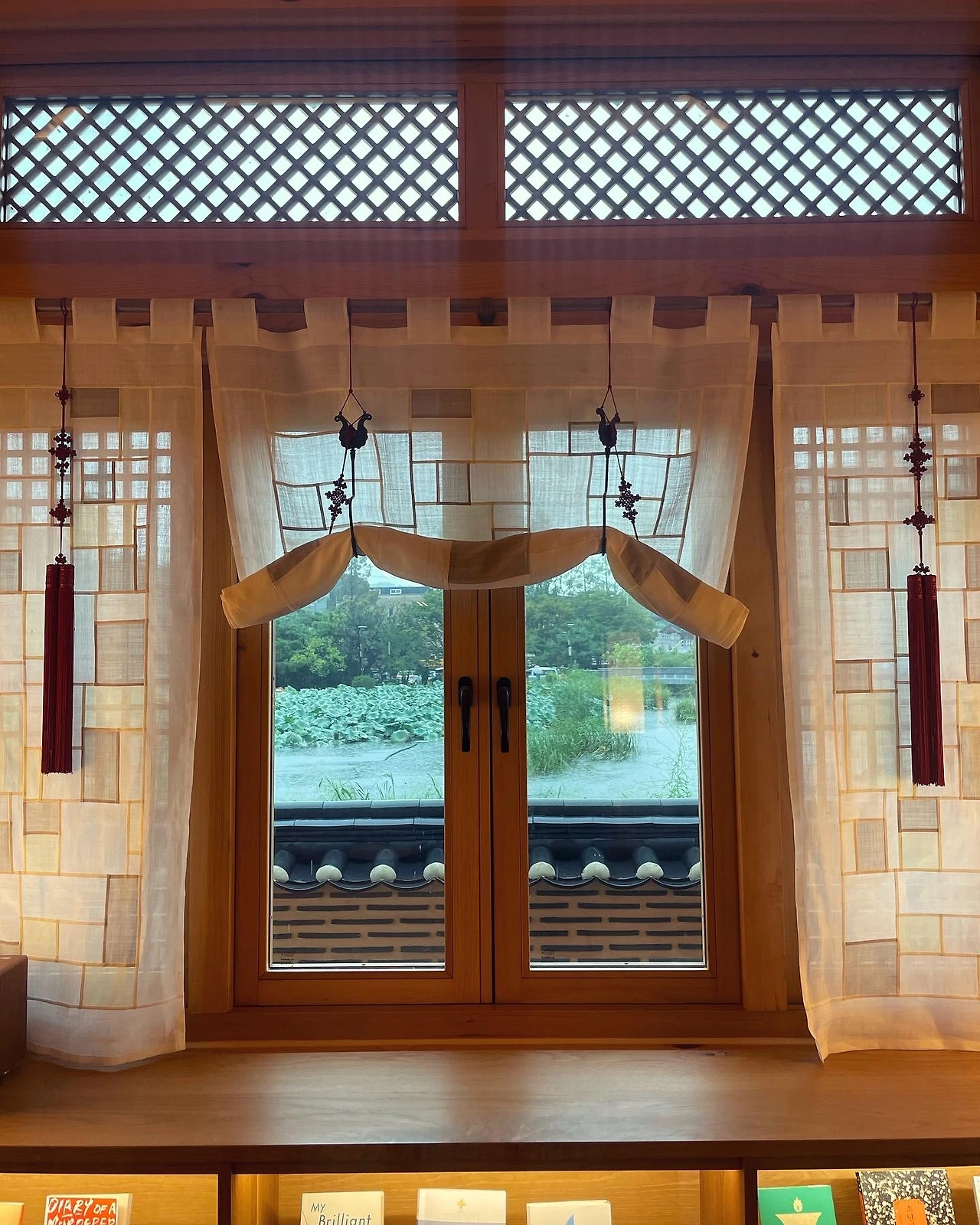 격자무늬 한옥 창 의자에 앉아 독서하는 본채 건너편 큰 방에서는 방석 위에 다리를 쭉 펴든지, 널부러질 수 있다. 엄마와 함께 와서 몸을 이리저리 굴리는 꼬마 아가씨, 예쁜 기억 쌓기를. 전통 문양 커튼에도, 천정의 나무 배열에도, 가야금으로 연주한 익숙한 선율들에도 더할 나위 없이 만족한다. 비오는 날의 풍경도 좋지 아니한가.
