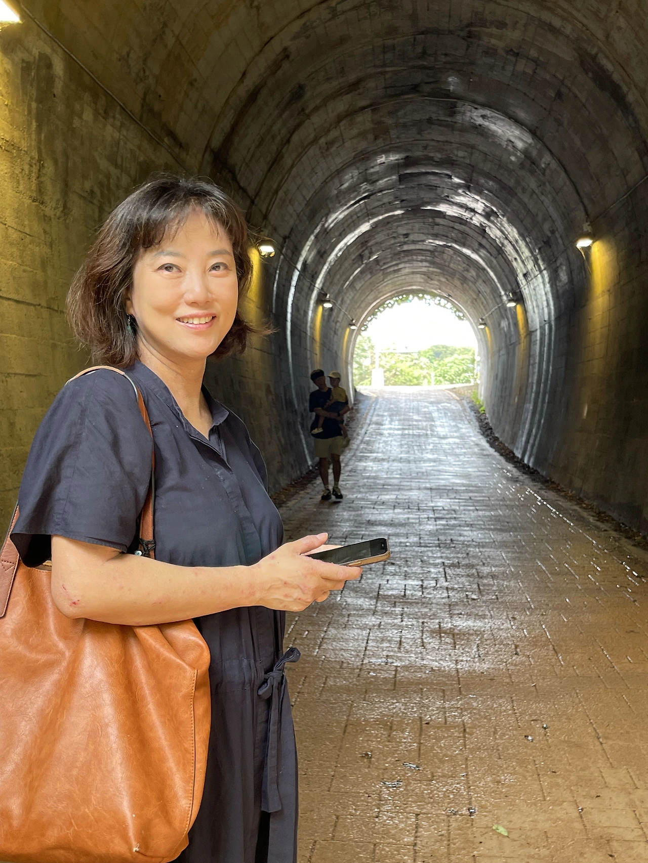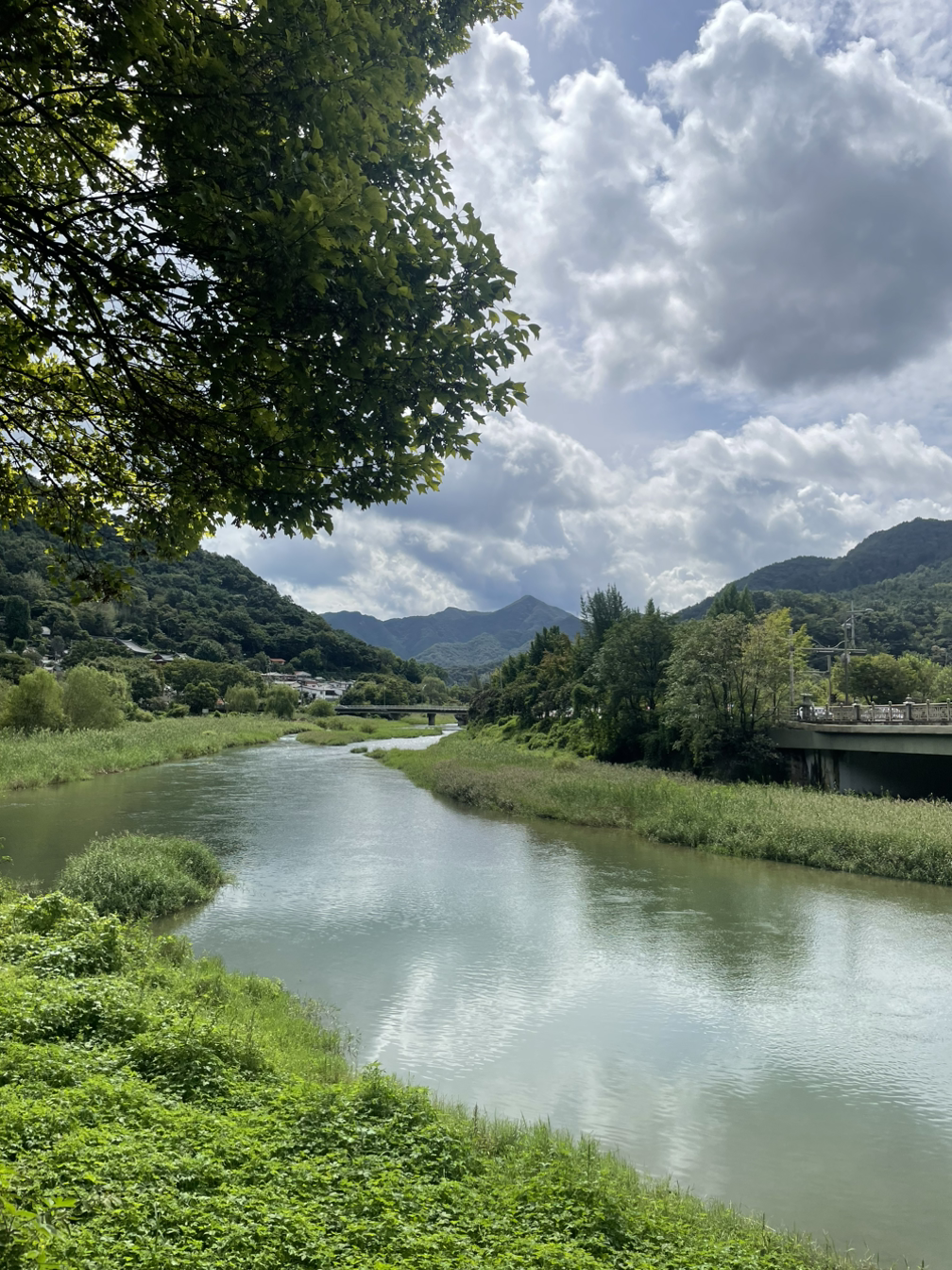 터널에서 길을 건너면 이번엔 천변 산책로. 저 멀리 언니네 집이란다. 비가 적게 오면 물이 줄어서 신발 벗고 첨벙첨벙 걸어간 길이었다고.