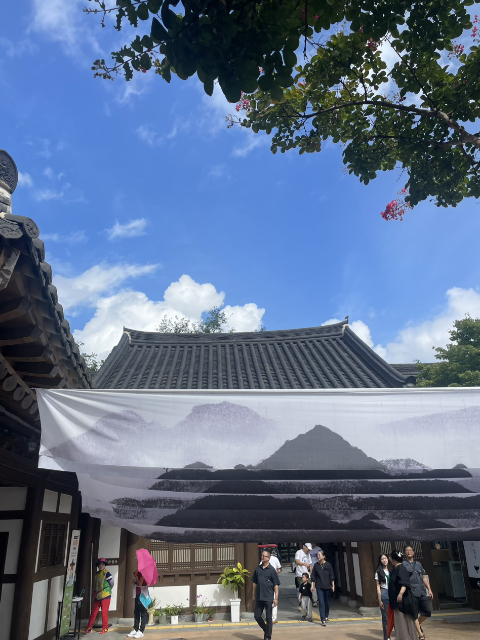 하늘과 구름이 열일하는 날. 비 예보와 달리 맑았다. 공예품전시관 마당엔 플래카드 여러장을 겹쳐 산을 그려낸 작품이 있었다.