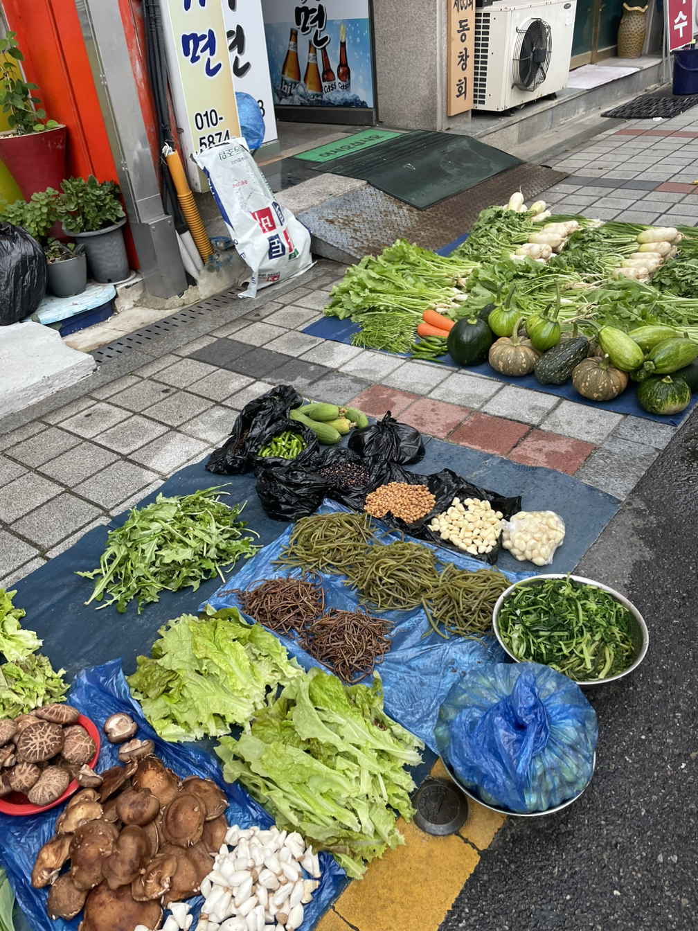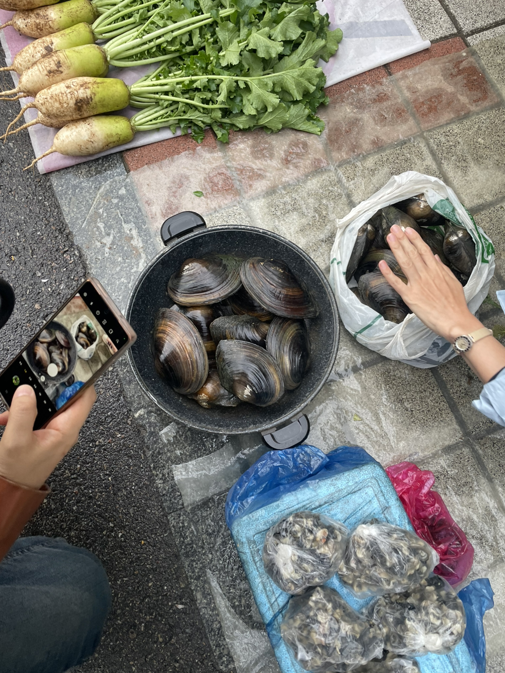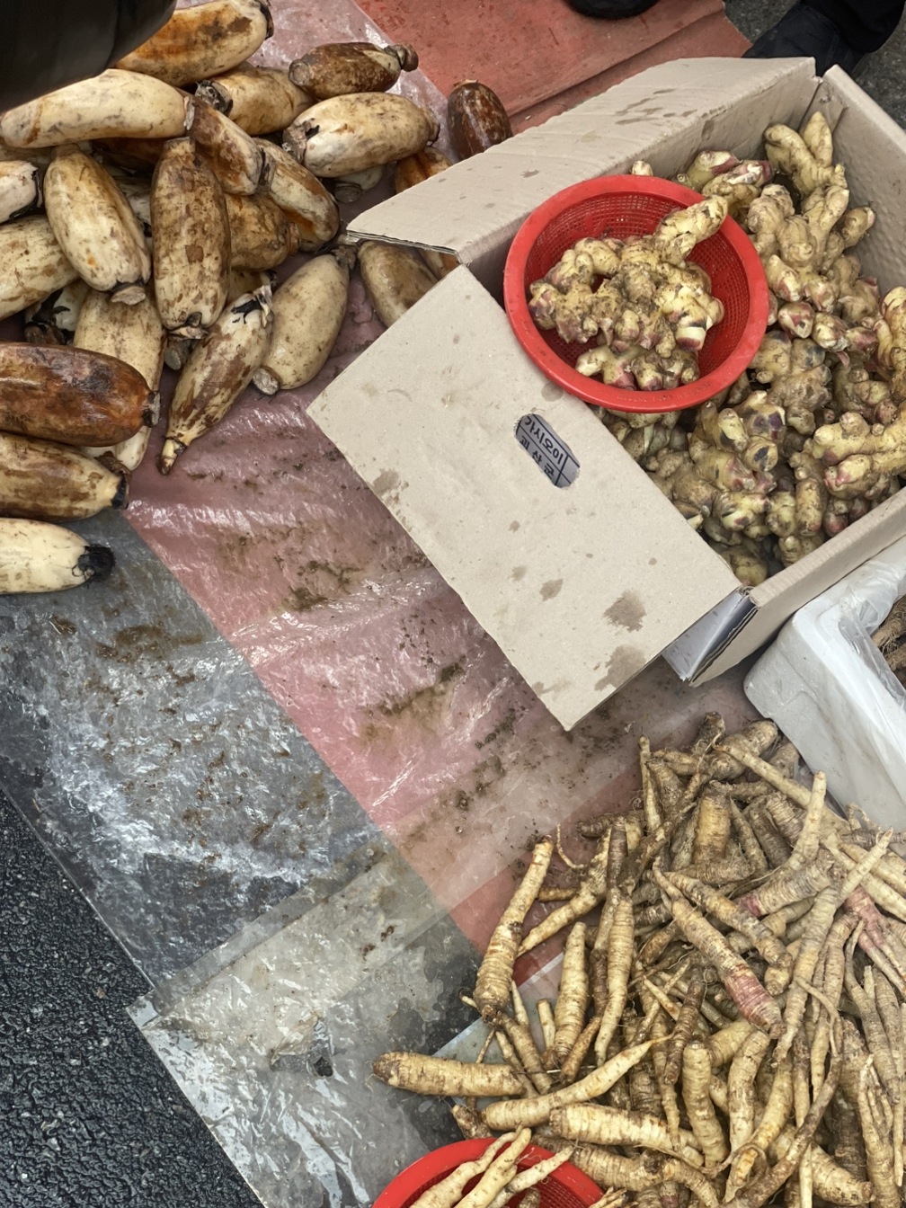 구경하는 재미와 일정상 사지 못하는 고통이 동시에 나를 덮쳤다. 손바닥보다 큰 민물 말조개는 하나가 아니라 한 바구니에 7000원. 흙냄새 향긋한 연근, 생강, 도라지도 마트에서는 보기 힘든 아이들이다. 펼쳐놓은 열무 더미가 4000원인데 3000원에 주시겠단다. 요즘 채소 물가가 미친 덕분에 후달리는 주부로서는 눈돌아가는 장터다.