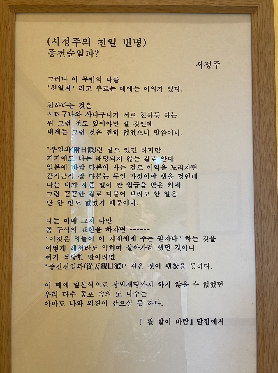 서정주는 친일을 인정하면서도 "이것은 하늘이 이 겨레에게 주는 팔자"라고 했다. 그럴 수 밖에 없었다? 모진 삶을 희생한 독립운동가들에게 부끄러워서라도 할 수 없는 고백이다. 성찰도 반성도 아니다.